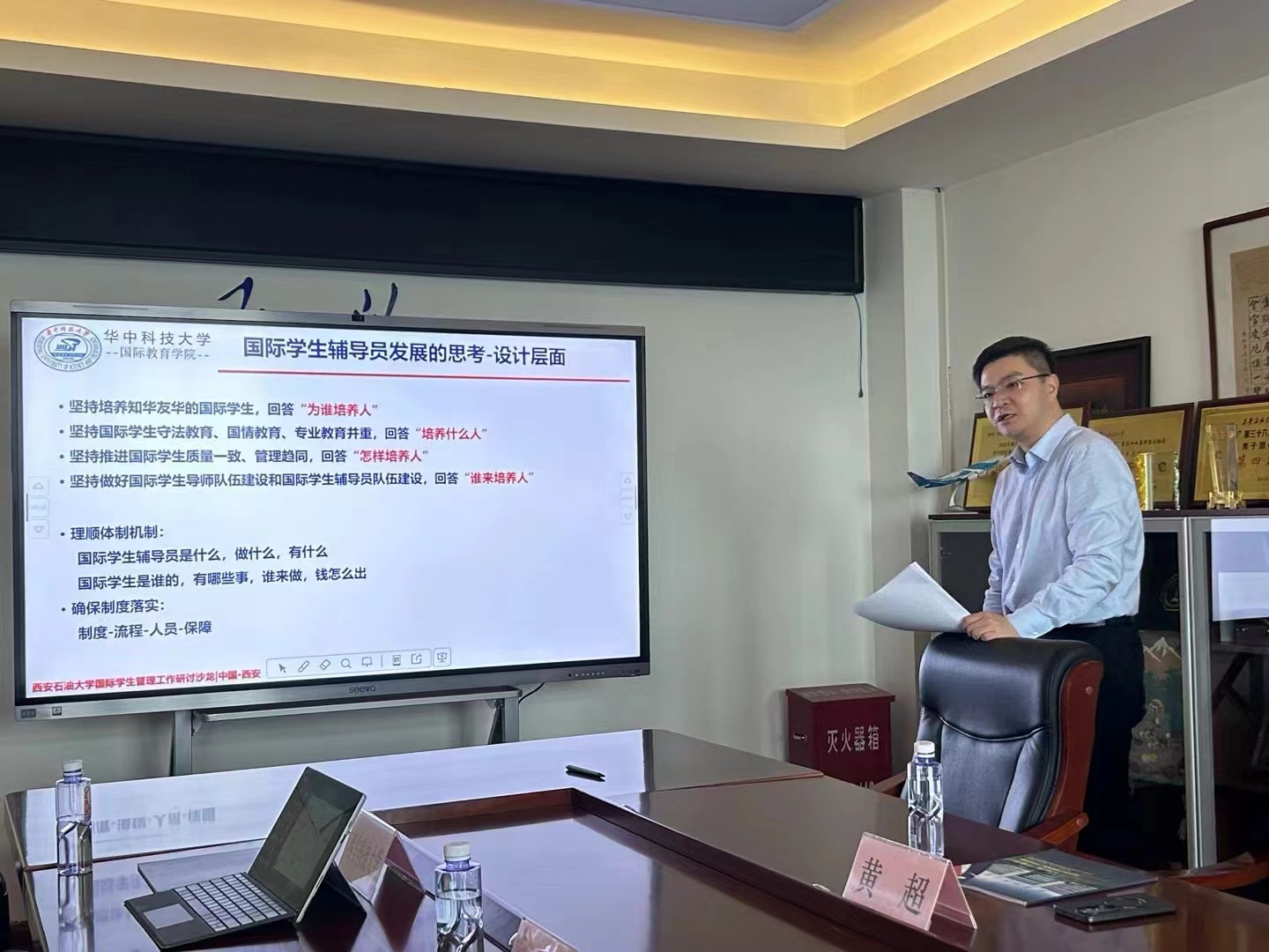 3月26日下午,國際教育學院在雁塔校區(qū)東方石油樓801會議室舉辦國際學生管理工作研討沙龍。此次研討沙龍第一講邀請了華中科技大學國際教育副院長黃超博士作專題講座和經(jīng)驗交流。國際教育學副院長顏庭星主持會議,中國地質大學(武漢)、西北大學、西安科技大學、西北政法大學等兄弟高校國際教育學院副院長、留管干部及學院全體國際學生輔導員參加此會議。
