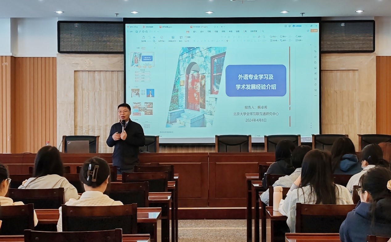 48日上午,外國語學(xué)院在邑校區(qū)圖書館第一會議室舉辦校友課堂之“外語專業(yè)學(xué)習(xí)及學(xué)術(shù)發(fā)展經(jīng)驗(yàn)介紹”。2014級英語專業(yè)畢業(yè)生、北京大學(xué)全球互聯(lián)互通中心助理研究員韓卓希應(yīng)邀擔(dān)任主講,學(xué)院90余名本科生聽取講座。講座由院黨委副書記王業(yè)青主持。