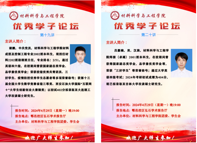 為充分發(fā)揮優(yōu)秀大學(xué)生的朋輩榜樣作用,營(yíng)造見(jiàn)賢思齊良好學(xué)習(xí)風(fēng)氣,向廣大備考學(xué)子提供寶貴的經(jīng)驗(yàn)借鑒,幫助學(xué)生更好地規(guī)劃考研之路。429日晚,材料科學(xué)與工程學(xué)院在鄠邑校區(qū)圖書(shū)館弘石學(xué)術(shù)報(bào)告廳舉辦優(yōu)秀學(xué)子論壇第十講和第二十講,本期邀請(qǐng)到的優(yōu)秀學(xué)子是我院材料成型及控制工程專業(yè)謝鵬同學(xué),目前以初試402分?jǐn)M錄取至大連理工大學(xué)攻讀碩士研究生;焊接技術(shù)與工程專業(yè)(卓越班)呂嘉楠同學(xué),以初試404分?jǐn)M錄取至吉林大學(xué)攻讀碩士研究生。學(xué)院300余名本科生參加論壇。