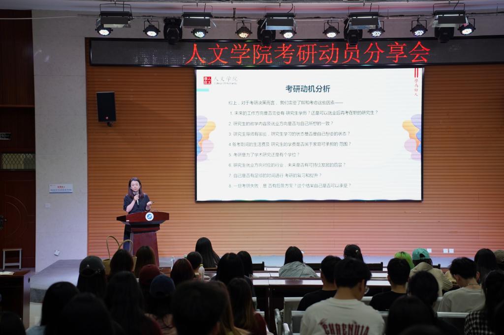 首先,副書記盛丹結合往年的考研形勢、錄取調劑情況和院校選擇等數據,進行深入分析,詳細介紹了人文學院的碩士學科設置,并提出了三點建議,一是要選擇合適的目標院校,堅守考研初心,基于自身興趣、能力、學業(yè)成績和綜合素質做出明智的選擇;二是要持之以恒,堅定考研信心,制定合理的備考計劃,保持積極向上的心態(tài),勇于面對挑戰(zhàn);三是要保持良好的生活習慣,規(guī)律作息、合理飲食和適量運動,學會調整心態(tài),遇到困難時積極尋求幫助和支持。