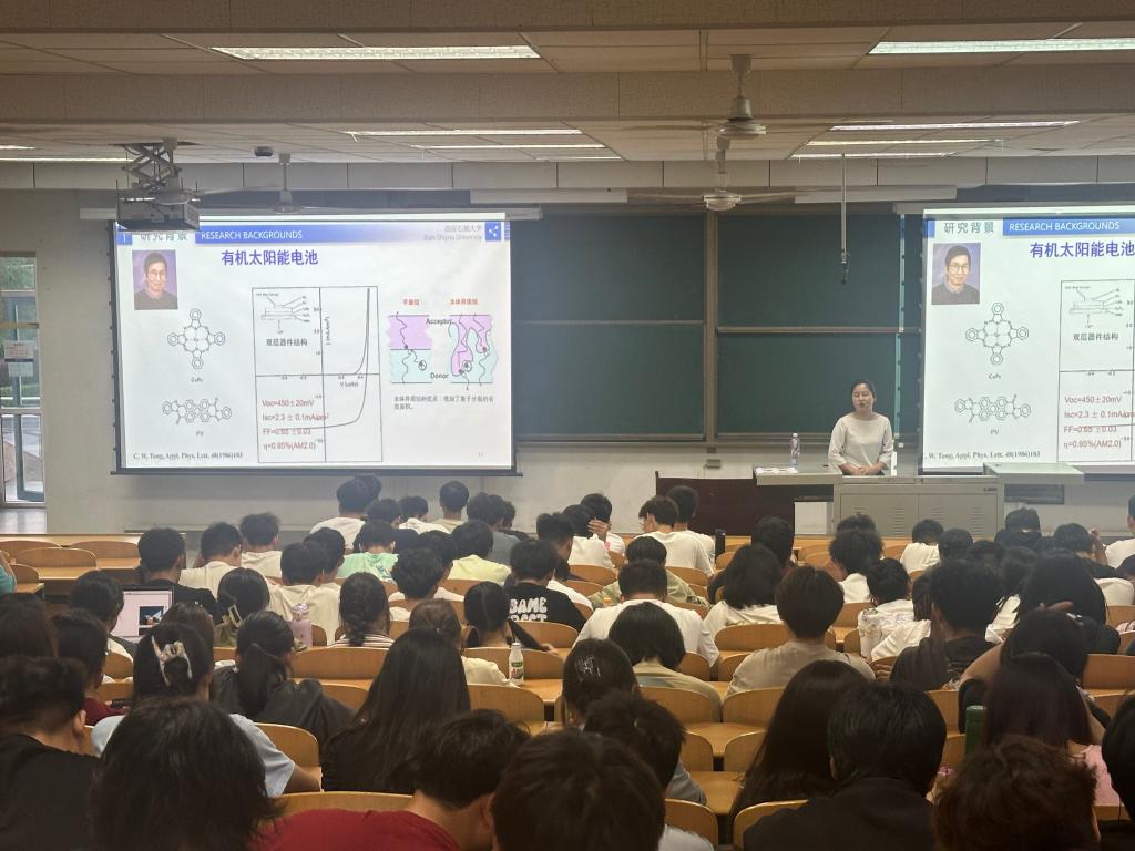 515日晚,學(xué)院新程大講堂第8講“光伏發(fā)電技術(shù)-有機(jī)太陽能電池”在鄠邑校區(qū)A139室開講。本次講座特邀學(xué)院新能源材料與器件系高歡歡擔(dān)任主講,學(xué)院2023級(jí)全體學(xué)生參加。講座中,高歡歡首先介紹了自己的學(xué)習(xí)和工作經(jīng)歷,接著向大一的同學(xué)們科普了當(dāng)前全球能源的嚴(yán)峻形勢(shì),強(qiáng)調(diào)新型綠色能源的開發(fā)和利用的必要性和緊迫性,詳細(xì)解讀了“雙碳”戰(zhàn)略提出的背景和重大意義,并由此引入講座的主題“體相異質(zhì)結(jié)有機(jī)太陽電池”。通過對(duì)從“器件效率”-“大面積柔性模”-“低成本光伏器件”-“綠色溶劑”-“穩(wěn)定性/壽命”不同發(fā)展階段,以及工作原理的詳細(xì)講解,讓同學(xué)們對(duì)自己所在的學(xué)科背景和知識(shí)有了更深層次的認(rèn)識(shí)。最后,高歡歡向同學(xué)們介紹了體相異質(zhì)結(jié)有機(jī)太陽能電池的發(fā)展趨勢(shì),以及光伏器件和活性層的制備過程和方法,并結(jié)合學(xué)院的課程設(shè)置,帶領(lǐng)同學(xué)們進(jìn)一步了解所學(xué)專業(yè)的培養(yǎng)方案和培養(yǎng)目標(biāo),鼓勵(lì)同學(xué)們不斷提高自身專業(yè)能力,在專業(yè)領(lǐng)域持續(xù)深耕,積極投身到我國的新能源行業(yè)建設(shè)當(dāng)中去。
