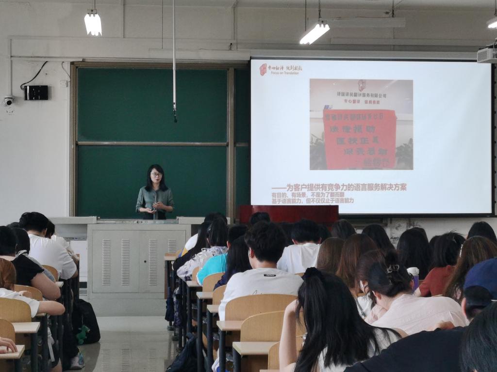 雷良瓊對該集團(tuán)公司的基本情況做了簡要介紹,圍繞翻譯行業(yè)現(xiàn)狀、行業(yè)性質(zhì)與特點(diǎn)進(jìn)行了全面講解,以全球語言服務(wù)行業(yè)發(fā)展趨勢圖為例,對全球語言服務(wù)進(jìn)行分析,講述了從翻譯到語言翻譯職業(yè)規(guī)劃與就業(yè)的變革。她強(qiáng)調(diào),學(xué)生應(yīng)熟練掌握全球主流機(jī)器翻譯平臺(tái)的使用,她以自身多年翻譯實(shí)踐經(jīng)驗(yàn)為學(xué)生提供了寶貴的關(guān)于專業(yè)學(xué)習(xí)與職業(yè)規(guī)劃的建議。