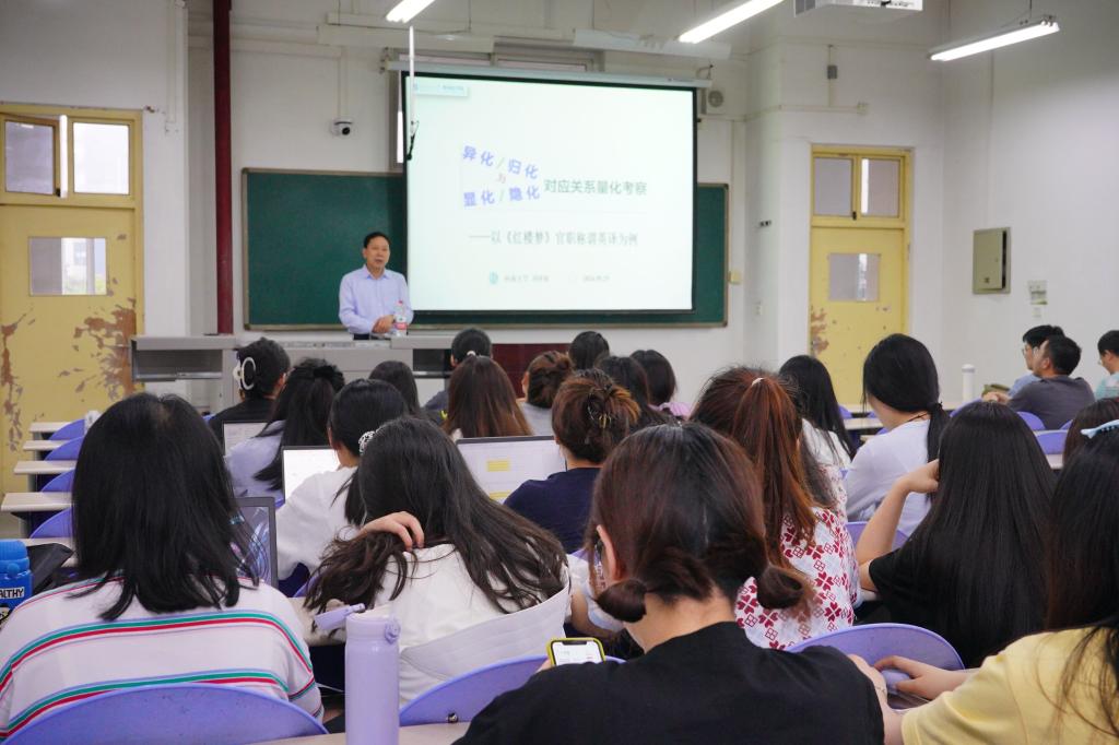 為加強研究生基礎(chǔ)知識學(xué)習(xí)、培養(yǎng)科研興趣、拓寬學(xué)術(shù)視野及啟迪思維。5月29日下午,外國語學(xué)院特別邀請河南大學(xué)二級教授、博士生導(dǎo)師劉澤權(quán)教授在鄠邑校區(qū)博覽樓A227開展了題為“異化/歸化與顯化/隱化對應(yīng)關(guān)系量化考察——以《紅樓夢》官稱英譯為例”的學(xué)術(shù)講座。外國語學(xué)院翻譯碩士一年級研究生及部分二、三年級學(xué)生聆聽了本次講座。