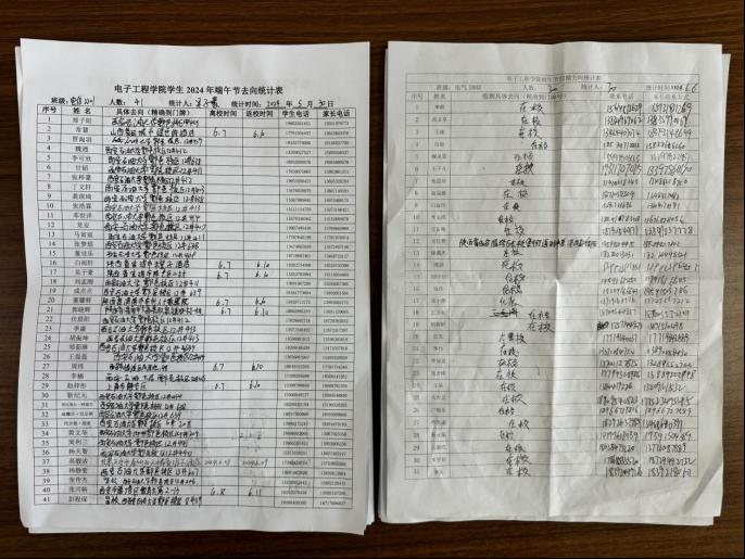 ——嚴格去向登記制度,加強精細管理保安全。臨近期末,各年級輔導(dǎo)員嚴格落實請銷假制度,并定期、主動與任課教師對接溝通學(xué)生課堂考勤情況,避免管理出現(xiàn)“真空”。節(jié)前與每位學(xué)生簽訂《電子工程學(xué)院學(xué)生2024年端午假期安全責(zé)任承諾書》,對各班學(xué)生端午去向進行動態(tài)跟蹤。