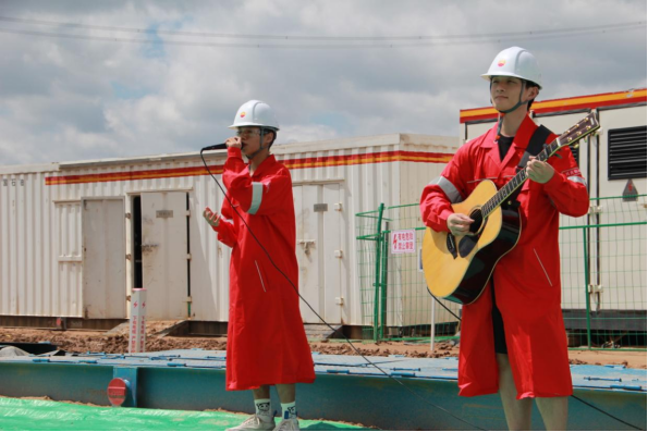 前期準備中,何云老師利用假期時間,悉心指導參演學生準備與排練,將鐵人精神與實踐教學相結(jié)合,精心準備了一系列經(jīng)典曲目。8月26日于50072鉆井隊,常超凡演唱的《石油人的歌》中拉開演出序幕,迅速調(diào)動起了石油工人們的熱情,贏得陣陣掌聲;由彭月懷演唱的民謠《春風十里》讓一線石油工人疲憊的身體在這宜人溫馨的歌聲中能得到一絲放松;民歌《小白楊》唱出了一線石油工人的情懷;吉他彈唱《無名的人》則是對這些默默無聞、堅守崗位的石油人鮮明的表達。