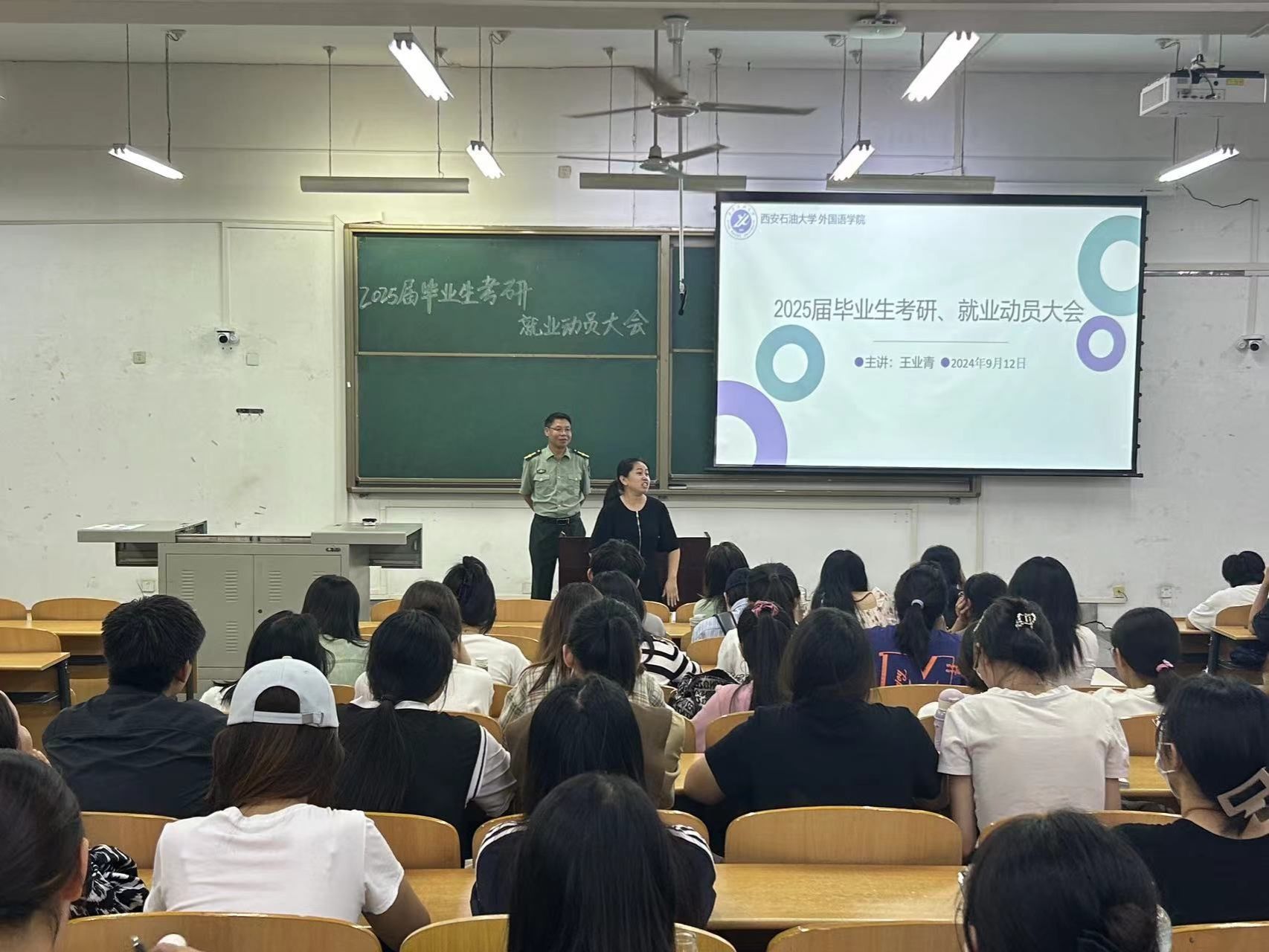 為切實做好2025屆本科畢業(yè)生就業(yè)工作,引導畢業(yè)生樹立正確就業(yè)觀念,提高就業(yè)積極性和主動性,助力畢業(yè)生順利求職升學,9月12日,外國語學院在博思樓B112教室召開2025屆本科畢業(yè)生就業(yè)動員大會。外國語學院黨委副書記王業(yè)青出席會議,學院2025屆本科畢業(yè)生近200人參加會議。會議由畢業(yè)班輔導員李青分主持。