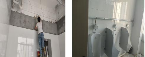 2.衛(wèi)生間改造。為改善教學(xué)樓衛(wèi)生間設(shè)施老化、滲漏水嚴(yán)重、衛(wèi)生狀況差、水壓不足等問題,暑假期間對(duì)教學(xué)樓部分衛(wèi)生間進(jìn)行改造。主要改造內(nèi)容為對(duì)衛(wèi)生間地面、防水、小便器、潔具、上下水、排風(fēng)、洗漱臺(tái)等進(jìn)行改造。本次共涉及衛(wèi)生間9間。