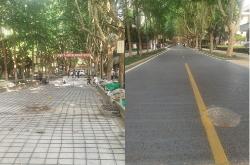 4.雁塔校區(qū)主干道路改造。雁塔校區(qū)主干道路面出現(xiàn)局部沉降、開裂,為保證行車安全。暑假期間,后勤處聯(lián)系海綿工程項(xiàng)目部對(duì)有問題的路面進(jìn)行維修加固。本次海綿項(xiàng)目部維修加固路面約700平方米。