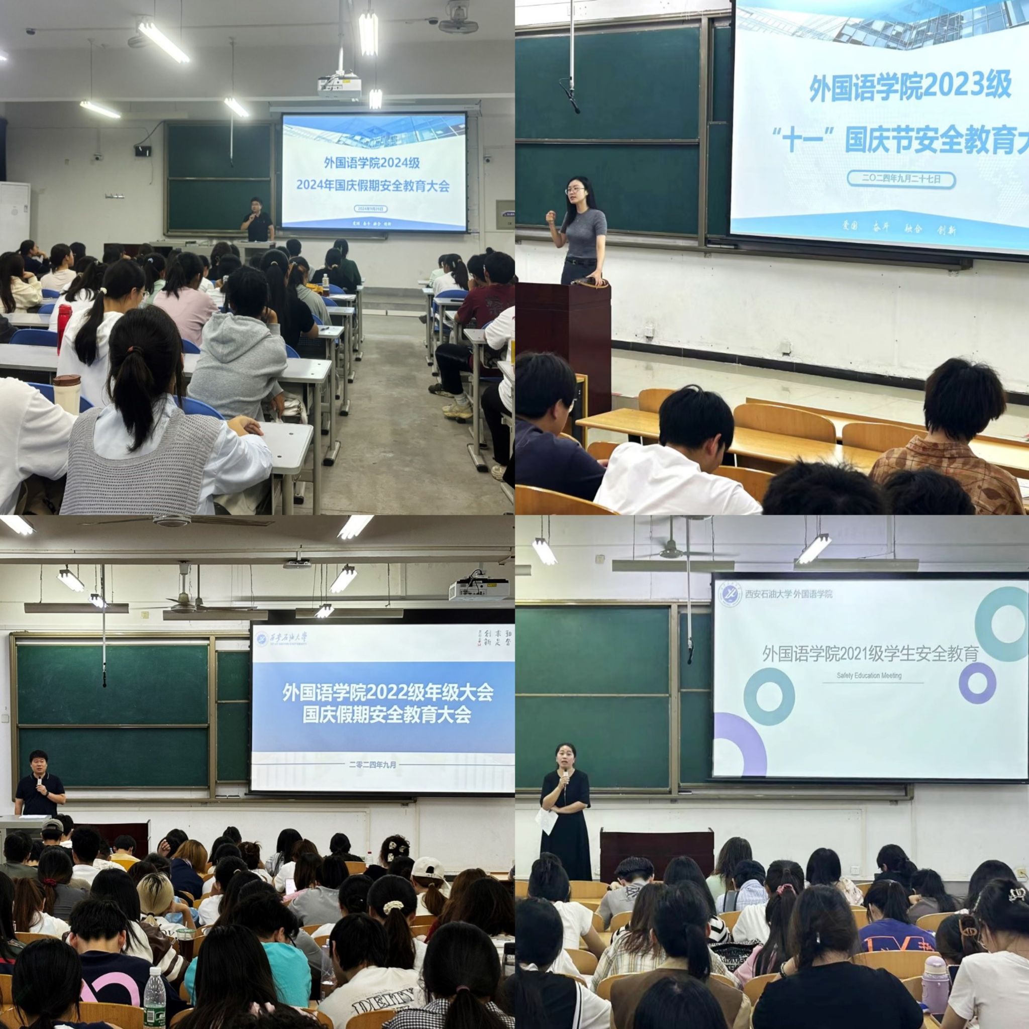 為提高學(xué)生安全意識,筑牢安全防線,落實學(xué)校和學(xué)院相關(guān)工作安排部署。近期,外國語學(xué)院各年級在鄠邑校區(qū)A316、A309、B121、B123、B112分別召開國慶節(jié)假期安全教育大會。