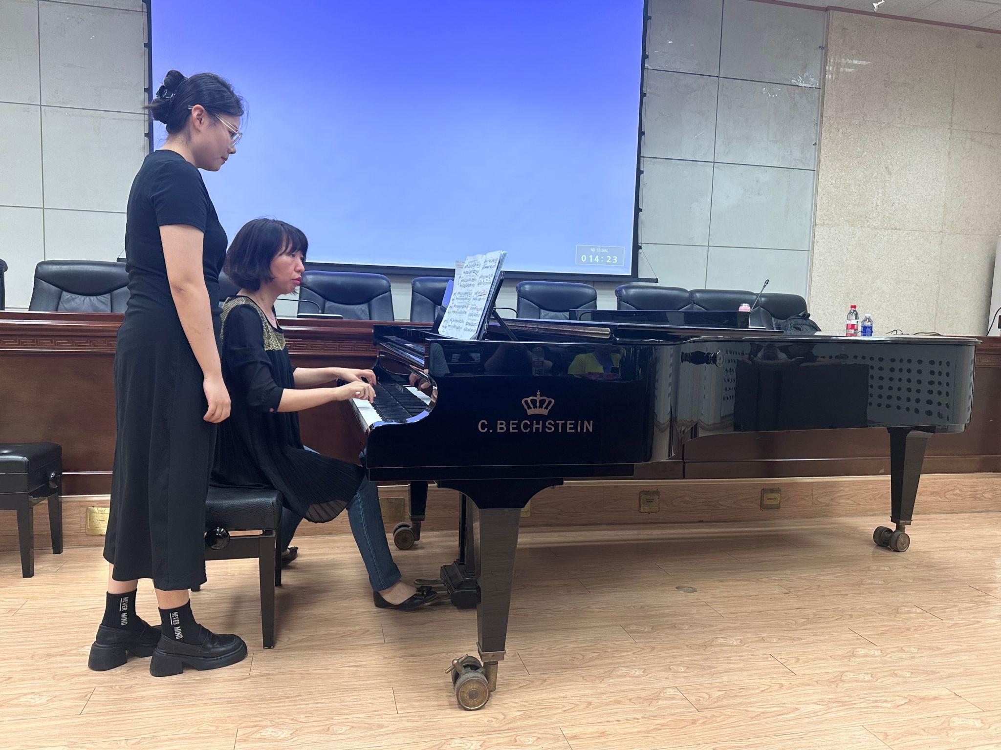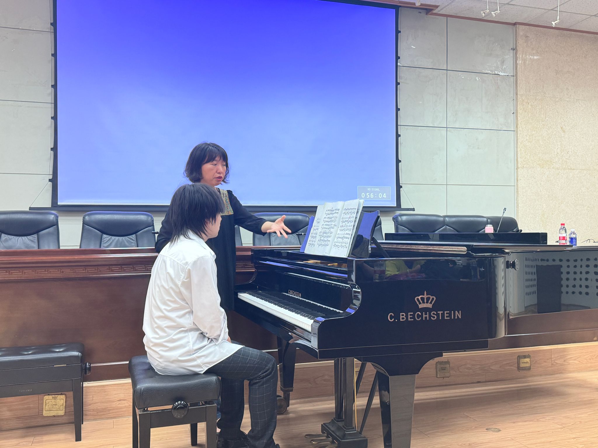 鋼琴學術(shù)講座的后半段是鋼琴教學實踐活動。第一位龔海軍同學演奏的是拉赫瑪尼諾夫《音樂瞬間》,劉玉茹老師用豐富的教學經(jīng)驗細致的給講解了樂句的旋律特點,節(jié)奏變化 ,每一個細節(jié)都被反復強調(diào)和練習,指導如何在鋼琴上準確地詮釋出拉赫瑪尼諾夫獨特的音樂風格。第二位同學袁馨怡演奏的是《新疆隨想回旋曲》,劉老師針對曲子中的高難度段落進行了細致入微的分析和示范,從快速的音階跑動到復雜的節(jié)奏把握,再到雙手的協(xié)調(diào)配合,每一個細節(jié)都被精準的拆解和演示。手把手的指導學生如何彈出作品的音樂風格。