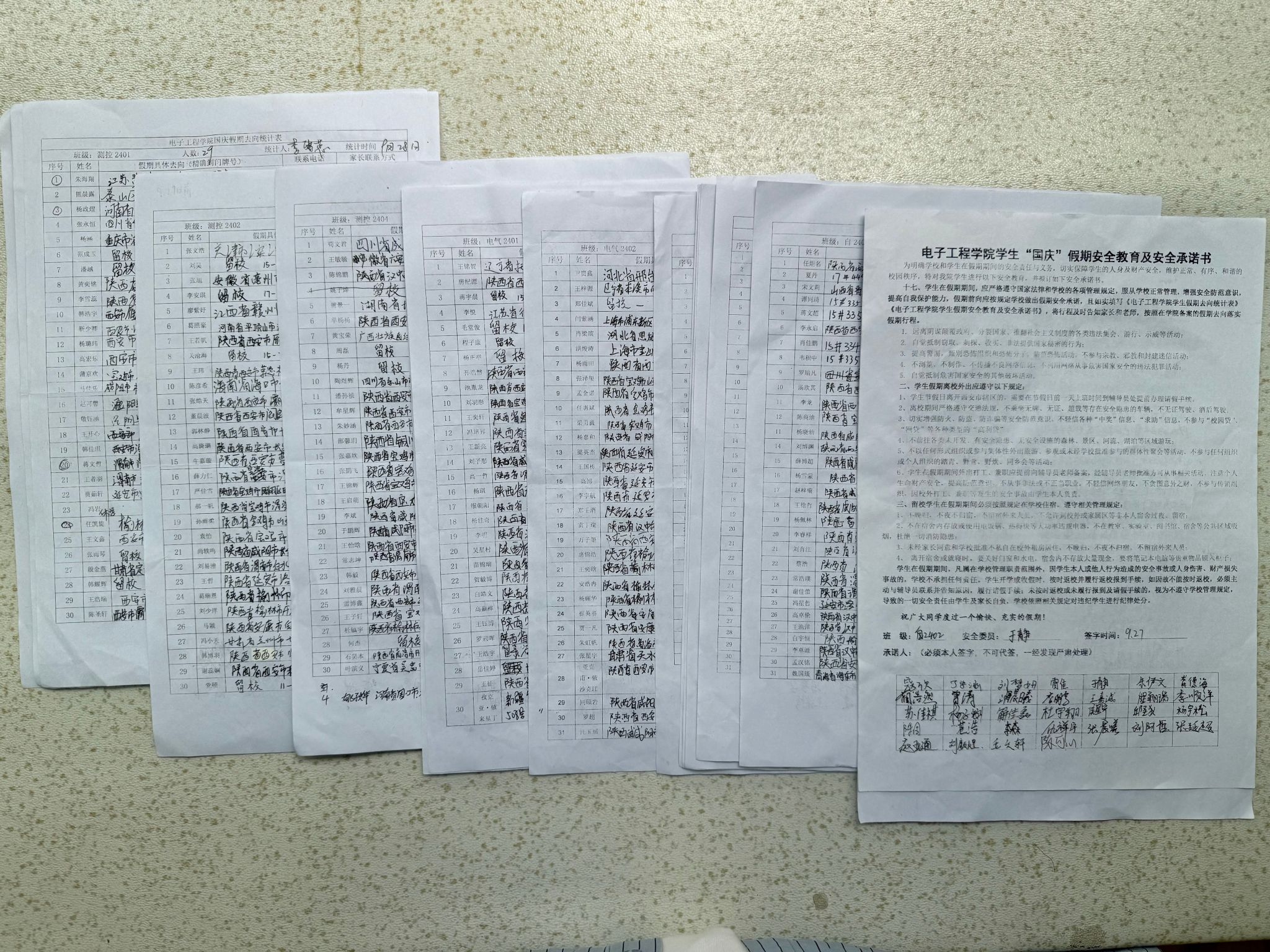 會(huì)后,各年級(jí)組織簽署了《電子工程學(xué)院學(xué)生2024年國慶假期安全責(zé)任承諾書》和《電子工程學(xué)院學(xué)生2024年國慶假期去向統(tǒng)計(jì)表》。