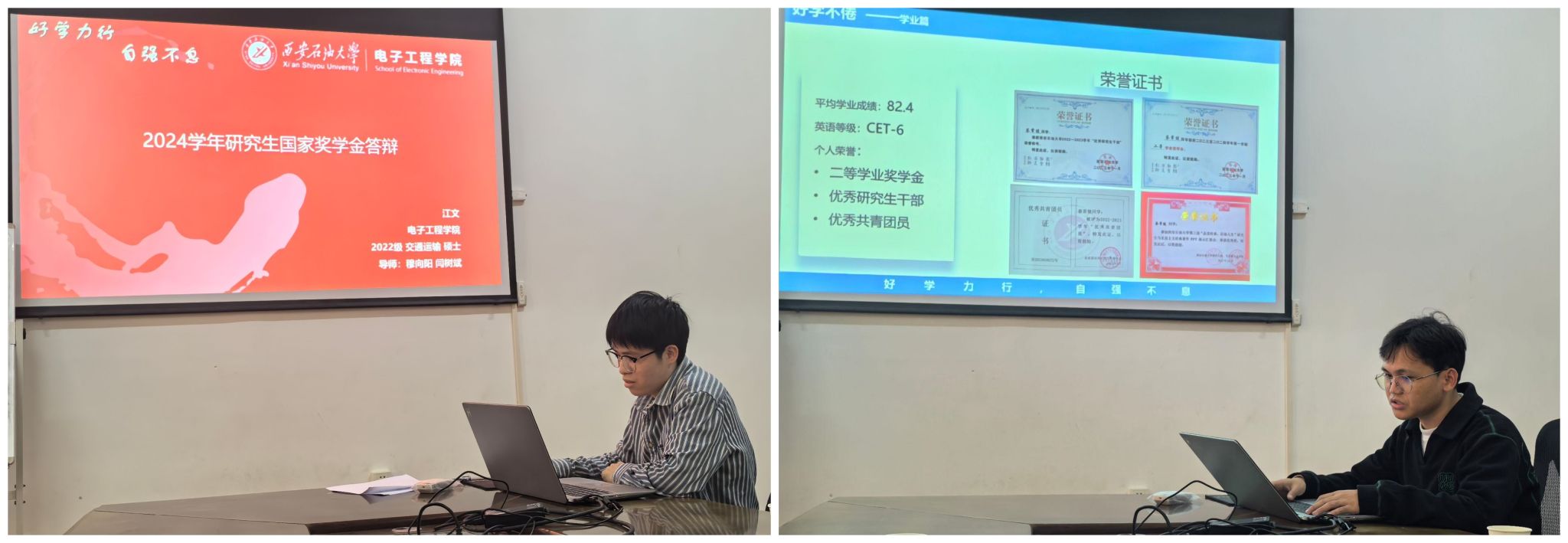 會(huì)議伊始,楊一宣讀了關(guān)于學(xué)校獎(jiǎng)學(xué)金評(píng)審工作的相關(guān)文件內(nèi)容以及學(xué)院獎(jiǎng)學(xué)金評(píng)審細(xì)則,分別介紹了國(guó)家獎(jiǎng)學(xué)金和中石油獎(jiǎng)學(xué)金評(píng)審要求,明晰了此次獎(jiǎng)學(xué)金評(píng)審的答辯規(guī)則。經(jīng)前期學(xué)生本人申請(qǐng)、資格審核、成果量化等環(huán)節(jié),候選人依次從思想道德、學(xué)業(yè)成績(jī)、學(xué)科競(jìng)賽、科研成果、社會(huì)實(shí)踐、志愿活動(dòng)等方面進(jìn)行了匯報(bào),就評(píng)委老師的提問(wèn)作出了回應(yīng)。最終確定張坤等7名同學(xué)為電子工程學(xué)院2024年研究生國(guó)家獎(jiǎng)學(xué)金擬推薦人選,荊夢(mèng)怡等2名同學(xué)為中石油獎(jiǎng)學(xué)金擬推薦人選并進(jìn)行公示。