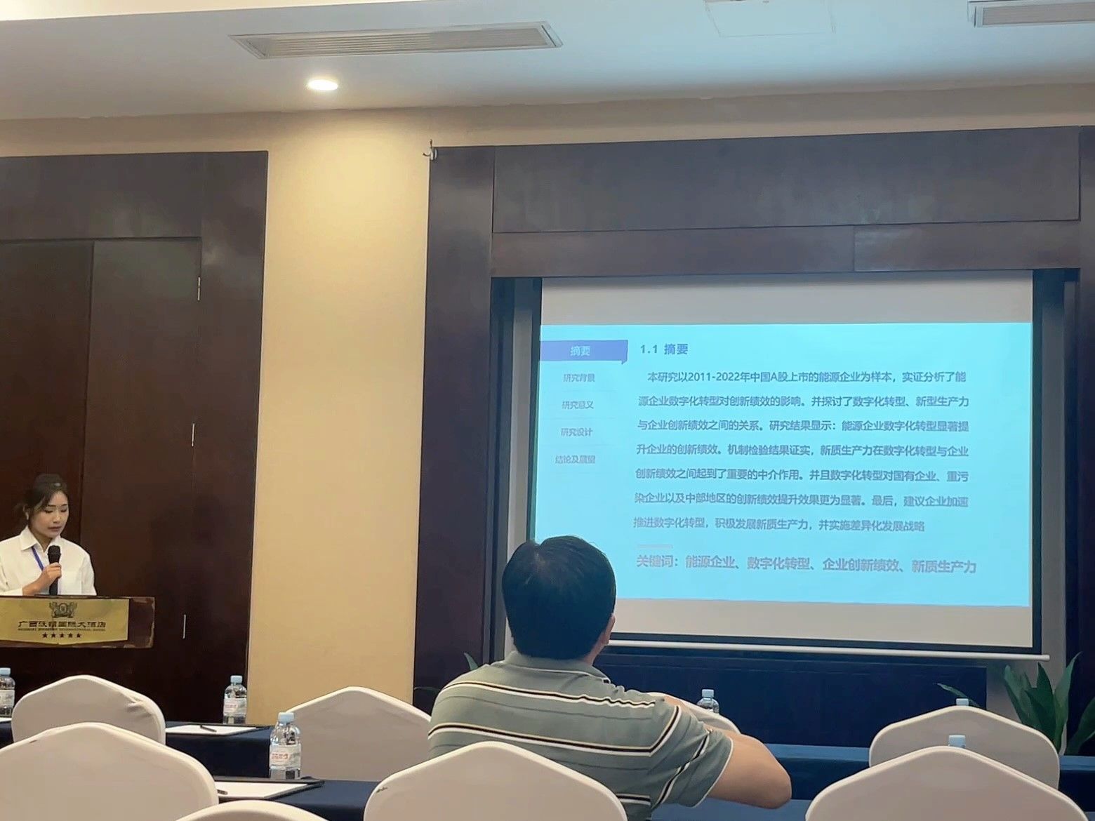張明同學(xué)作了題為《能源企業(yè)數(shù)字化轉(zhuǎn)型與企業(yè)創(chuàng)新績(jī)效—基于新質(zhì)生產(chǎn)力的調(diào)節(jié)作用》 的專題報(bào)告。該報(bào)告介紹了能源企業(yè)數(shù)字化轉(zhuǎn)型與企業(yè)創(chuàng)新績(jī)效之間的關(guān)系,以A股上市能源企業(yè)為研究對(duì)象,實(shí)證分析了能源企業(yè)數(shù)字化轉(zhuǎn)型對(duì)創(chuàng)新績(jī)效的影響。