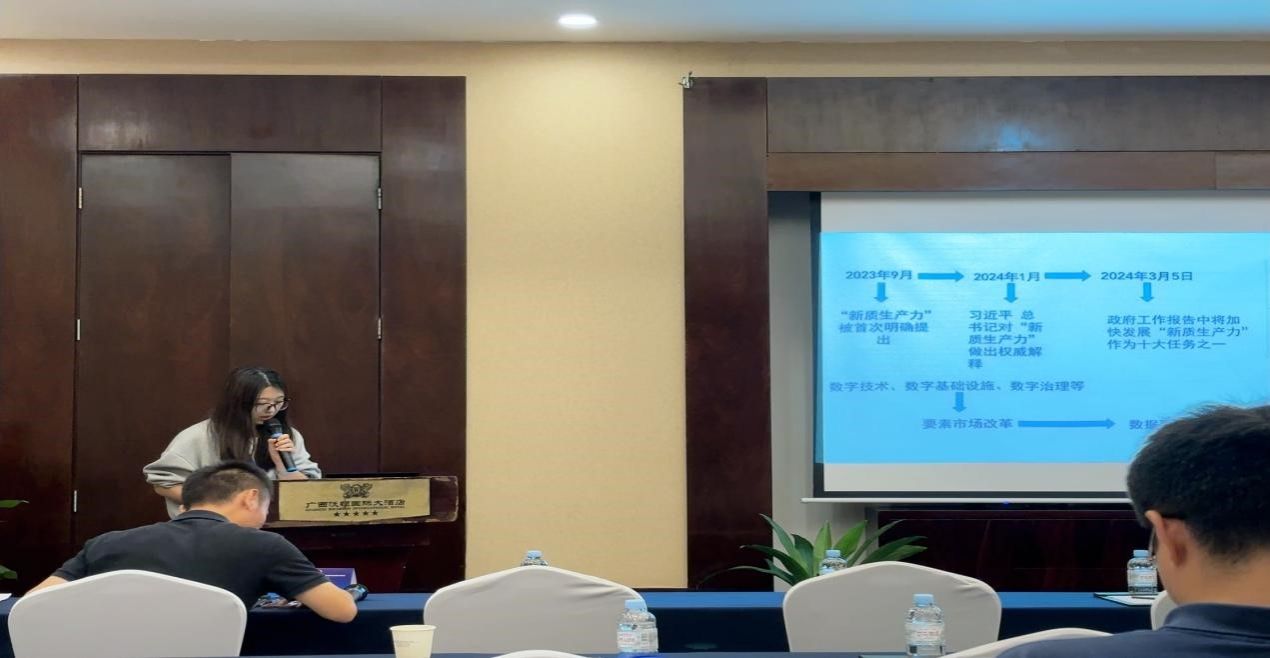 劉姿君同學(xué)作了題為《數(shù)字經(jīng)濟(jì)賦能區(qū)域新質(zhì)生產(chǎn)力發(fā)展:理論分析與實(shí)證檢驗(yàn)》的專題報(bào)告。該報(bào)告基于2012-2022年中國(guó)省級(jí)面板數(shù)據(jù),通過構(gòu)建數(shù)字經(jīng)濟(jì)發(fā)展指數(shù)和新質(zhì)生產(chǎn)力指數(shù)實(shí)證檢驗(yàn)數(shù)字經(jīng)濟(jì)對(duì)區(qū)域新質(zhì)生產(chǎn)力的影響,分析了數(shù)字經(jīng)濟(jì)對(duì)新質(zhì)生產(chǎn)力的門檻效應(yīng)。