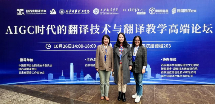 “AIGC時(shí)代的翻譯技術(shù)與翻譯教學(xué)”高端論壇于10月26日在西安成功舉辦,本次論壇由中國翻譯協(xié)會(huì)翻譯技術(shù)委員會(huì)、陜西省翻譯協(xié)會(huì)及甘肅省翻譯工作者協(xié)會(huì)指導(dǎo),西安明德理工學(xué)院語言文化傳播學(xué)院主辦,西安翻譯學(xué)院國際語言文化學(xué)院、博碩星睿翻譯技術(shù)教育研究院、西安迪佳悟信息技術(shù)有限公司及福州譯國譯民集團(tuán)有限公司協(xié)辦。此次論壇匯聚了來自翻譯技術(shù)與教學(xué)領(lǐng)域的知名專家學(xué)者,外國語學(xué)院教師原愛紅、李芳蕾、拓葳參加了本次論壇。