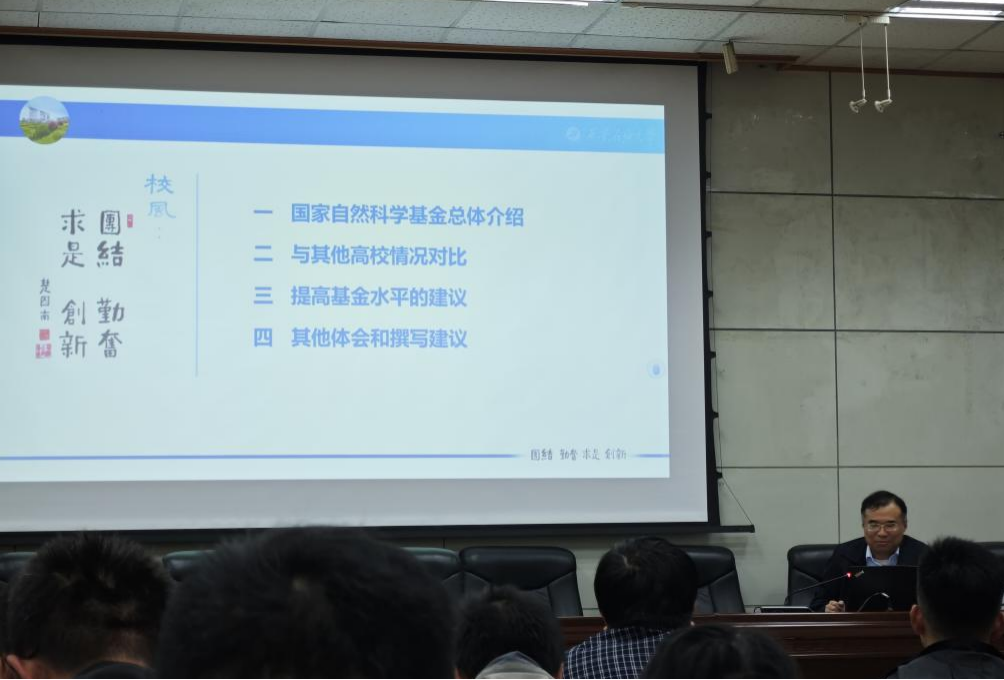蔡建文結(jié)合近幾年學(xué)院各項(xiàng)重點(diǎn)工作開展的經(jīng)驗(yàn),強(qiáng)調(diào)了國家自然科學(xué)基金項(xiàng)目對(duì)于學(xué)院發(fā)展、學(xué)科建設(shè)以及教師個(gè)人成長發(fā)展的重要性,動(dòng)員全體專業(yè)教師積極申報(bào)國家自然科學(xué)基金項(xiàng)目,爭取既有質(zhì)的提升又有量的突破。