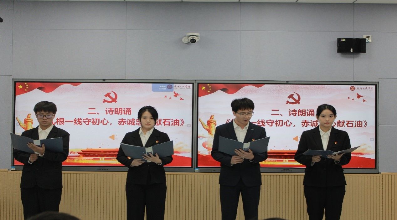 活動伊始,參會同志共同唱響《國際歌》,堅定理想信念。隨后,支部優(yōu)秀預(yù)備黨員張晗喆彭芃、趙嘉博、宋浩婷同志帶來詩朗誦,展現(xiàn)在國家對能源需求日益增長的背景下,百萬石油工人埋頭苦干,以扎扎實實的行動,實實在在的業(yè)績,向黨和國家交出亮麗成績單的風采。接著與會同志觀看了石油工程學院已經(jīng)畢業(yè)的扎根一線的黨員為在校學弟學妹精心錄取的寄語視頻,學習他們奮戰(zhàn)在萬米井場、煉化車間、加油站點等為祖國的石油事業(yè)默默堅守、無私奉獻的精神。