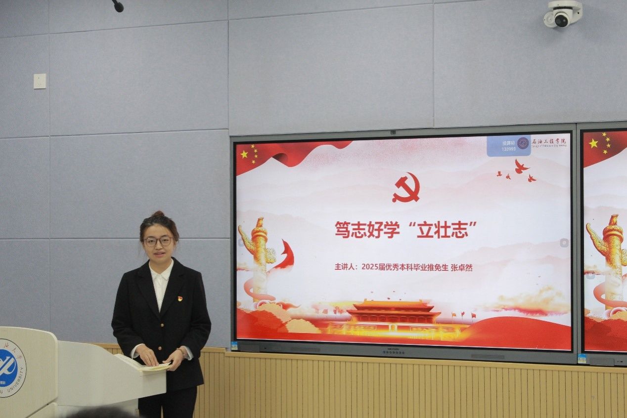 第二十七屆研究生支教團成員鄭楊博成功保研至北京大學的張卓然進行了經(jīng)驗分享。各位優(yōu)秀的同志以積極的態(tài)度和行動,帶動身邊的每一個人共同創(chuàng)造精彩篇章。之后支部書記王班騫講黨課,帶領(lǐng)大家學習了習近平總書記在國家勛章和國家榮譽稱號頒授儀式上的重要講話,并觀看了國家勛章和國家榮譽稱號頒授儀式現(xiàn)場視頻,呼吁大家作為新一代石油學子,要深入學習貫徹習近平總書記關(guān)于國家能源安全的重要論述,牢記習近平總書記的殷切囑托,堅決貫徹落實國家能源安全新戰(zhàn)略,大力弘揚石油精神和鐵人精神,努力學習專業(yè)知識和行業(yè)前沿理論,為保障國家能源安全貢獻青春力量。