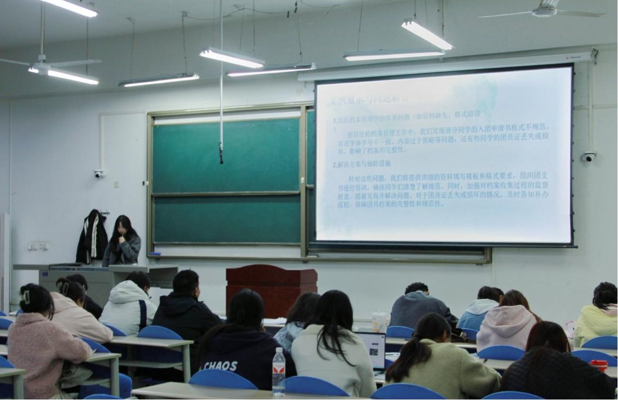 11月20日,人文學院團委學生會組織部部長郭雨涵帶來了“團務工作實務”主題講座,2024級全體團支書、輔導員助理以及組織部干事參加。本次講座圍繞著團務工作的實際操作展開,為大學生團干部講解了具體的基礎團務工作操作方法與智慧團建的使用說明。在講座中,郭雨涵列舉了日常工作可能面臨的問題,并且給出了解決方法,她強調,在收集資料的時候確保內容和數量正確是至關重要的。對于智慧團建這一網絡系統(tǒng),她表示,智慧團建是現代團務工作的重要信息化平臺,也是各位團干部展開團務工作的重要網絡陣地,各位團干部需要牢牢掌握系統(tǒng)的使用方法,運用網絡工具更好地服務同學。