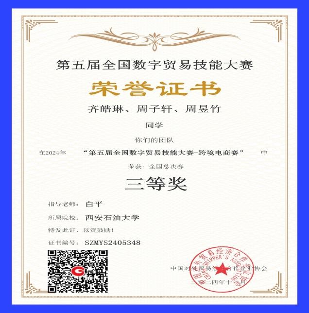 2024年11月20日-11月24日,由中國對外貿(mào)易經(jīng)濟(jì)合作企業(yè)協(xié)會主辦,南京步驚云軟件有限公司承辦的“第五屆全國數(shù)字貿(mào)易技能大賽跨境電商賽項(xiàng)”成功舉辦。來自全國217所本科、高職、中職院校的3592支隊(duì)伍共計(jì)10776人參加了比賽,其中中職組232支隊(duì)伍,選手696人;高職組1251支隊(duì)伍,選手3753人;本科組2109支隊(duì)伍,選手6327人。經(jīng)過五天的激烈角逐,由白平老師指導(dǎo)的1支參賽隊(duì)伍在本次比賽中榮獲全國三等獎。