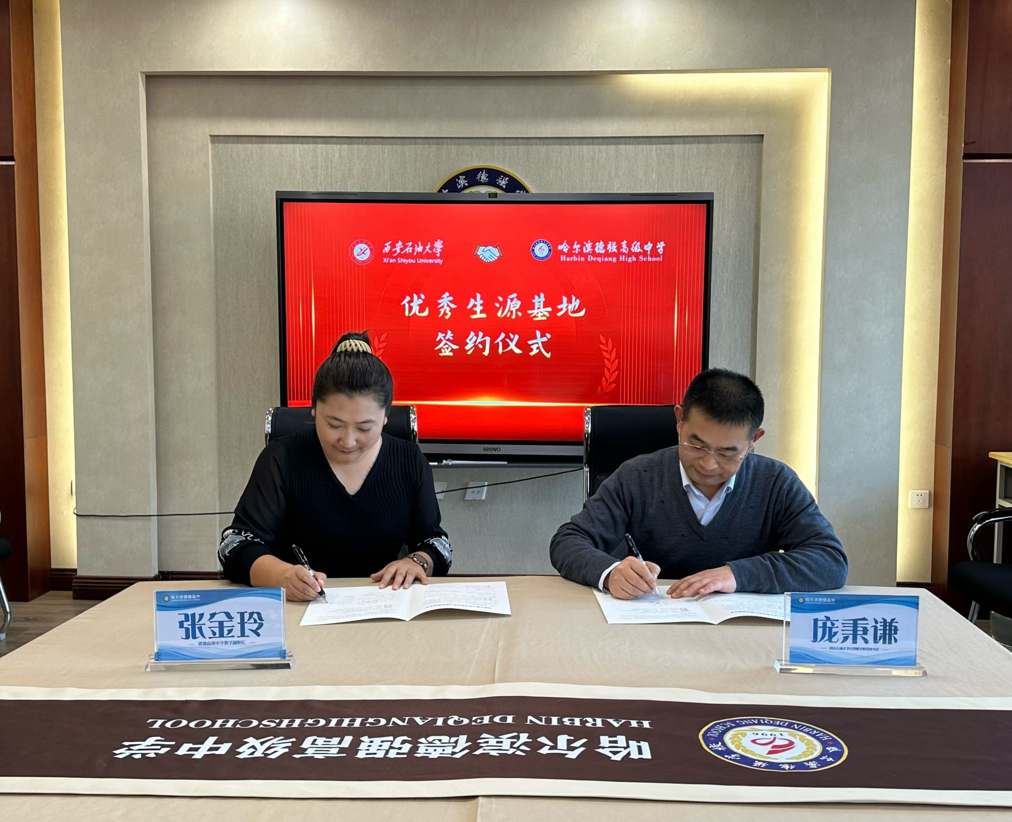 龐秉謙代表學校與哈爾濱德強高級中學張金玲副校長簽署了《西安石油大學優(yōu)秀生源基地建設協議》,授予“優(yōu)秀生源基地”牌匾并贈送了錄取喜報。
