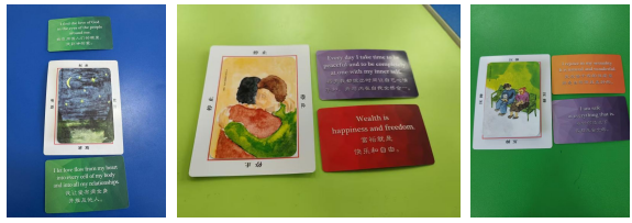本次活動主題為“卡牌心橋—與自己對話”,意在通過歐卡牌讓同學們更深入、更直觀地感受到自身心理映射和情緒體驗,并通過交流分享,助力大家避免壓抑、開放身心?;顒娱_始,同學們隨機分為三個小組,李夏凝讓每位同學以動物自比,幫助大家初步了解個人性格和特質(zhì)。隨后,進行歐卡牌團訓,同學們分四次分別抽取彩虹卡、圖卡、字卡、彩虹卡,并圍繞卡牌內(nèi)容、選擇理由、自身感受等進行分享。最后,李夏凝邀請有分享意愿的同學進行發(fā)言,講述自身體會,并以此為衍伸,鼓勵同學們在生活中要敢說、想說、多說,及時表達自我,避免因憋悶、鉆牛角尖等形成不好的情緒體驗。整個活動氛圍親切、溫馨,同學們紛紛表示體驗感極佳,也通過本次活動在一些問題上有了新的認識,更清楚了內(nèi)心深處的想法。