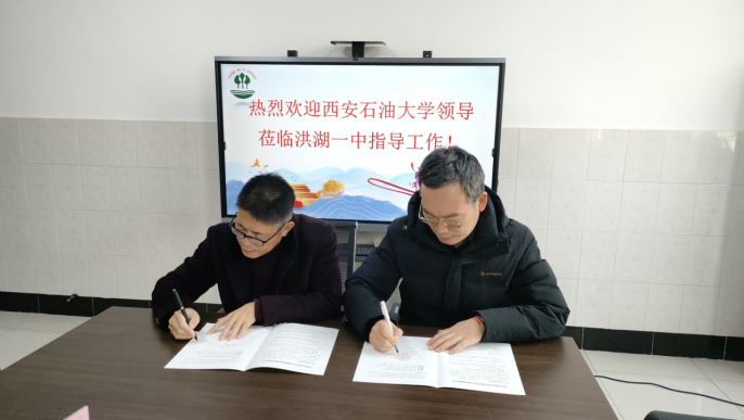 在洪湖市,學(xué)校一行與洪湖市第一中學(xué)副校長戴裕明等領(lǐng)導(dǎo)進行座談。雙方介紹了各自的辦學(xué)歷史、辦學(xué)規(guī)模、辦學(xué)特色,并就繼續(xù)開展更為深入的合作進行深入交流。張建高代表學(xué)校與洪湖市第一中學(xué)領(lǐng)導(dǎo)共同簽署《西安石油大學(xué)優(yōu)秀生源基地建設(shè)協(xié)議》,授予“優(yōu)秀生源基地”牌匾并贈送了錄取喜報。