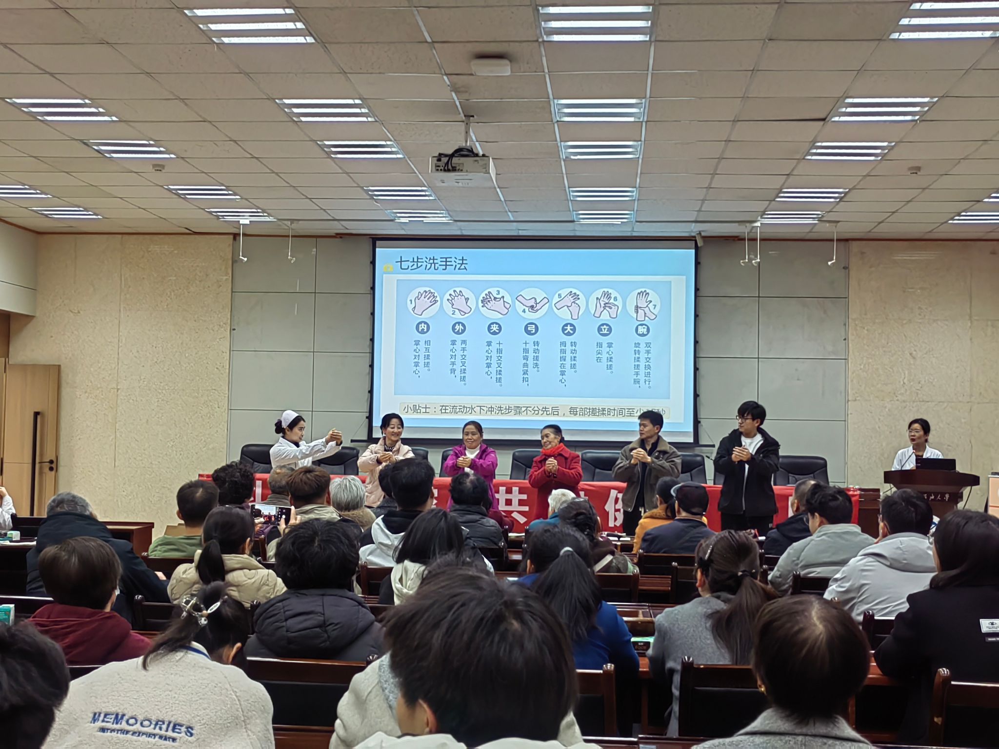 本次講座由校醫(yī)院經(jīng)驗(yàn)豐富的主治醫(yī)師洪艷萍主講。講座中,洪醫(yī)生結(jié)合春季傳染病的流行特點(diǎn),以通俗易懂的語言,詳細(xì)講解了流感、新冠、手足口、水痘、麻疹、諾如病毒感染等常見傳染病的發(fā)病癥狀、傳播途徑、預(yù)防措施等知識(shí)。同時(shí),她還強(qiáng)調(diào)了保持良好個(gè)人衛(wèi)生習(xí)慣、加強(qiáng)體育鍛煉、及時(shí)接種疫苗等預(yù)防手段的重要性,并針對(duì)師生們提出的疑問進(jìn)行了耐心解答。最后,還通過現(xiàn)場(chǎng)分解演示“七步洗手法”,細(xì)致講解每一步驟的要領(lǐng),大家積極嘗試,并通過現(xiàn)場(chǎng)互動(dòng)來強(qiáng)化記憶,現(xiàn)場(chǎng)氛圍濃厚,有效提升了師生日常防護(hù)意識(shí)及操作的規(guī)范性。