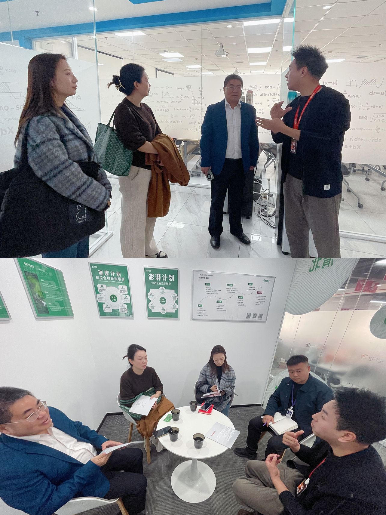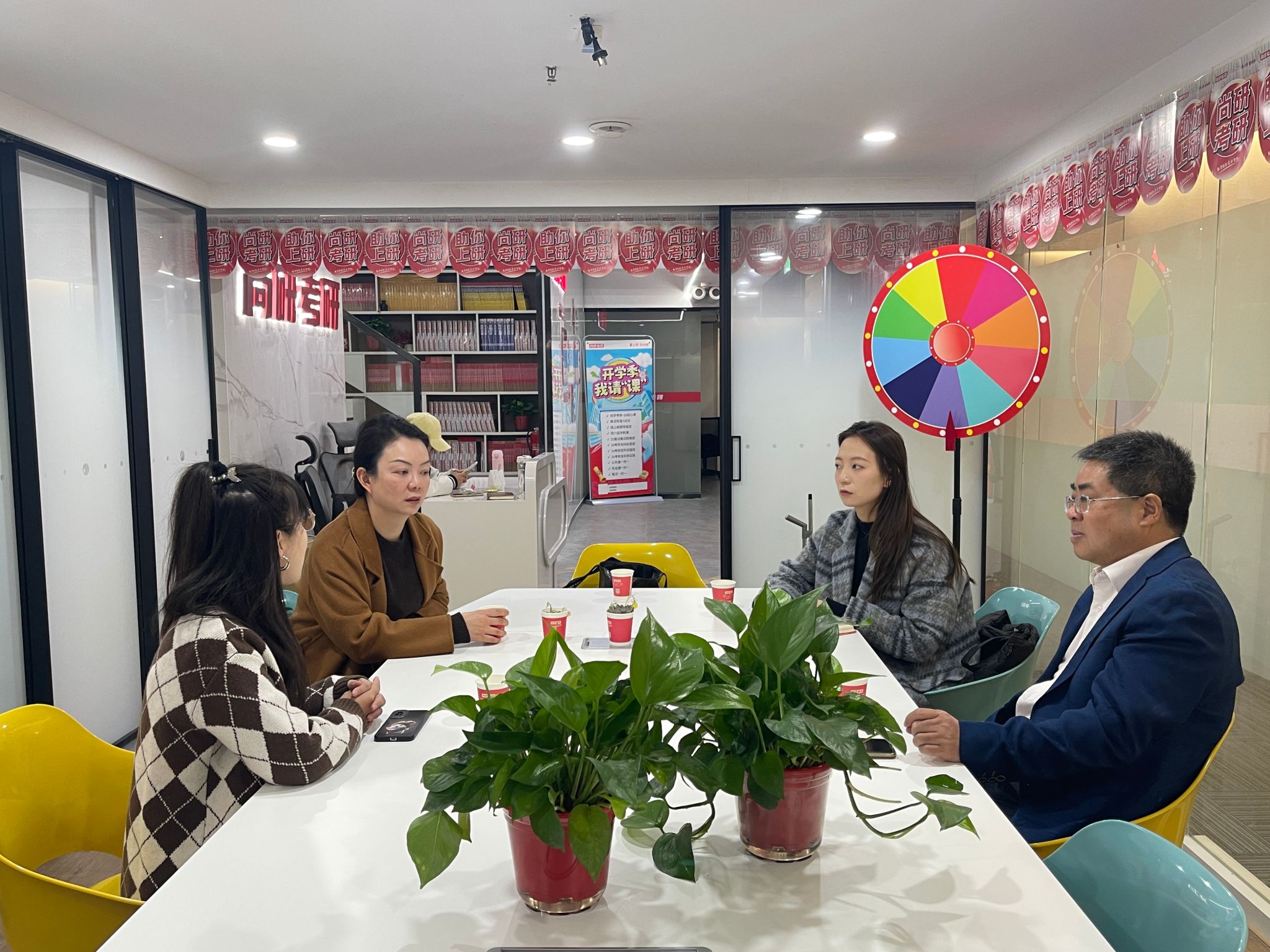 隨后,學院一行來到尚研考研,雙方圍繞四六級成績提升、考研輔導(dǎo)、考公能力培養(yǎng)等議題展開深入探討。盛丹闡述了人文學院學生在考研、升學、考公等領(lǐng)域的多元需求。尚研考研負責人劉老師詳細介紹了機構(gòu)的特色課程體系與服務(wù)優(yōu)勢,提出了“四六級專項提升+考研全流程規(guī)劃”的初步合作方案,并表示將優(yōu)先保障人文學院學生的公益課程資源。