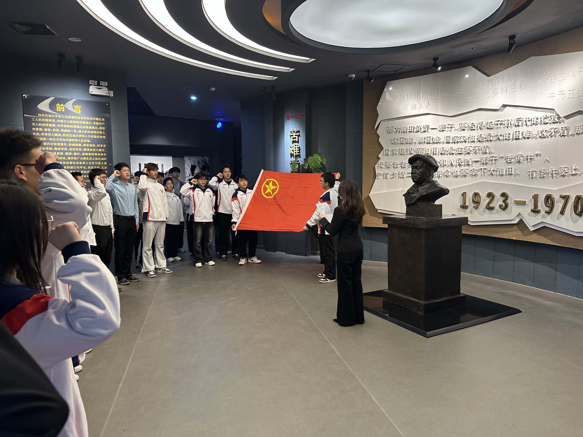 參觀結(jié)束后,大家在鐵人塑像前莊嚴(yán)列隊(duì),面向團(tuán)旗重溫入團(tuán)誓詞。鏗鏘有力的誓言回蕩在紀(jì)念館內(nèi),展現(xiàn)了青年學(xué)子傳承先烈遺志、勇?lián)鷷r(shí)代使命的決心。