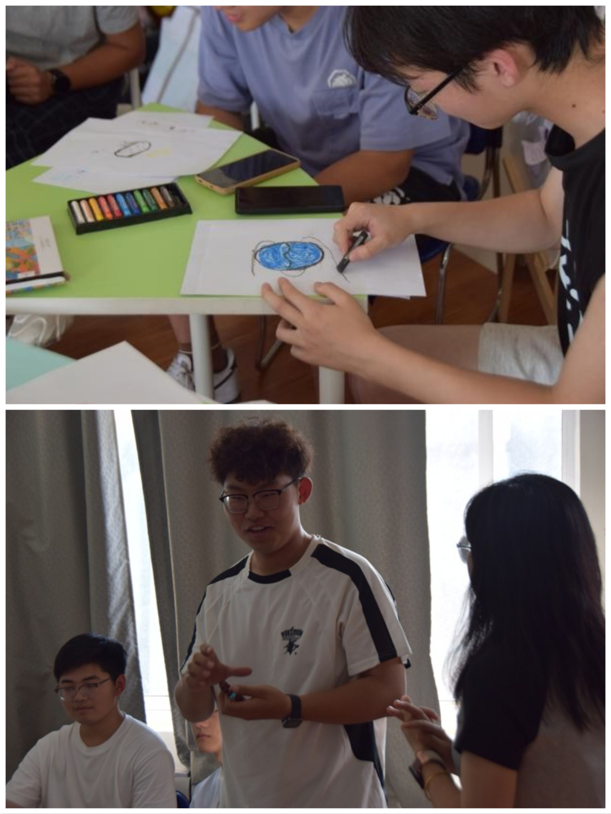 自我探索階段,通過(guò)畫(huà)蛋與破蛋的過(guò)程探索深意,參與者繪制屬于自己的蛋,交換后由同伴畫(huà)出蛋破之后誕生的景象。當(dāng)?shù)盎貧w主人手中,同伴的創(chuàng)作帶來(lái)了意想不到的視角和驚喜,隨后的以物喻己分享,同學(xué)們用帶來(lái)的小物件介紹自己并闡述其如何幫助自己保持平衡,深化了自我覺(jué)察,也啟發(fā)了助人先護(hù)己的思考。