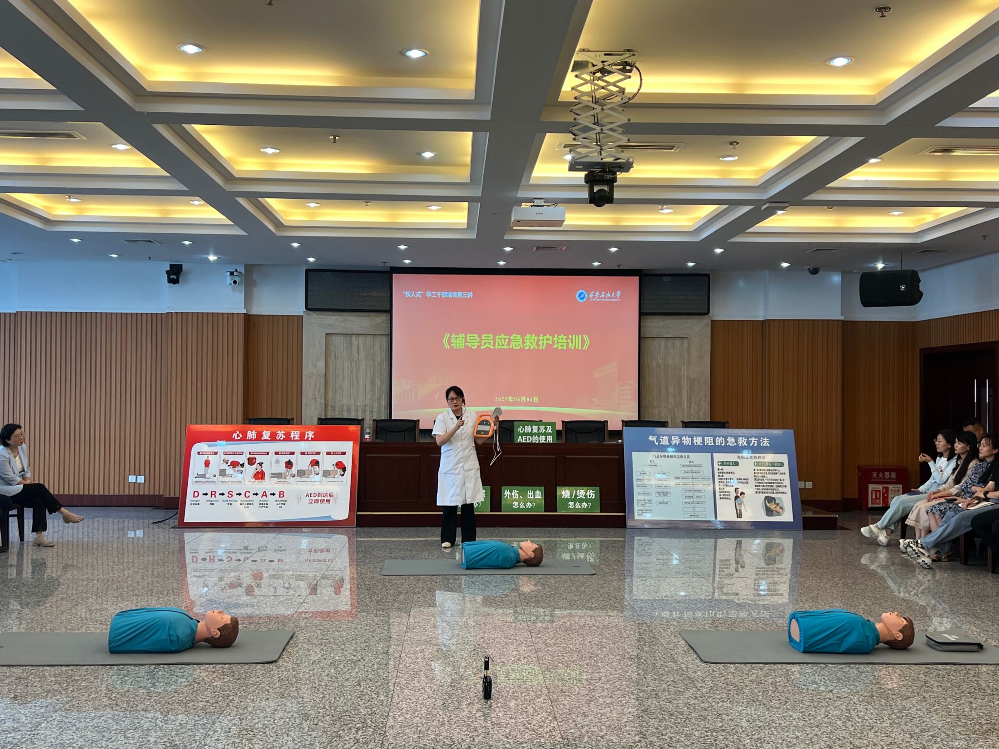 為進一步提升學工干部應急處置能力,打造素質過硬的“鐵人式”學工干部隊伍,6月4日下午學生工作部在鄠邑校區(qū)圖書館第一會議室開展“鐵人式”學工干部培訓第三講——輔導員應急救護專題培訓。本次培訓由校醫(yī)院具有中國紅十字會救護師資宋彥霞醫(yī)生擔任講師。培訓由學生工作部副部長畢軼慧主持,校醫(yī)院相關醫(yī)護人員及全體學工干部參加。