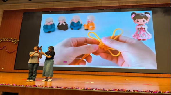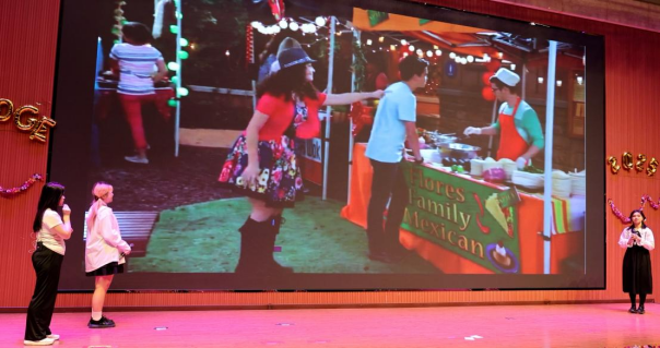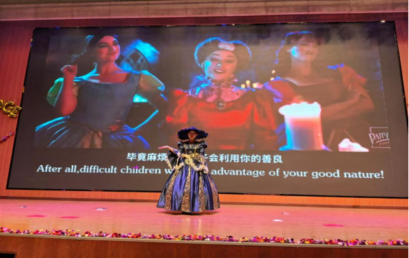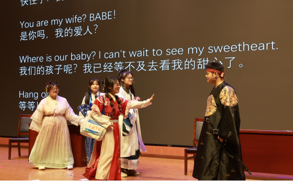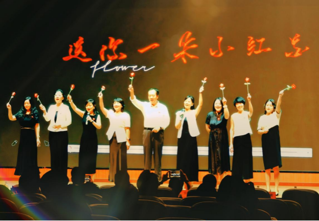 本次匯報演出共24個節(jié)目,分別由《英語電影賞析》《英語歌曲與英語文化》《中國文化推介》《跨文化交際視聽說》《英漢翻譯技巧與實踐》和《實用英語寫作》6門大學(xué)英語拓展課程的同學(xué)及教師參演。節(jié)目異彩紛呈,涵蓋了電影配音、拓展課程介紹、歌曲演唱、英語話劇、跨文化情景劇短視頻、舞蹈、相聲等多種形式。在本次課程匯演的舞臺上,外國語學(xué)院第一教學(xué)部拓展課程組教師溫情獻(xiàn)唱,致敬成長,傾情演繹歌曲《送你一朵小紅花》。他們從講臺走向舞臺,用溫暖而真摯的歌聲傳遞著對莘莘學(xué)子的關(guān)愛與期許。這首飽含鼓勵與祝福的旋律,在師生心中播撒下溫暖與力量,成為匯演中一抹動人的亮色,生動詮釋了和諧融洽、積極向上的校園文化氛圍與教育溫度。