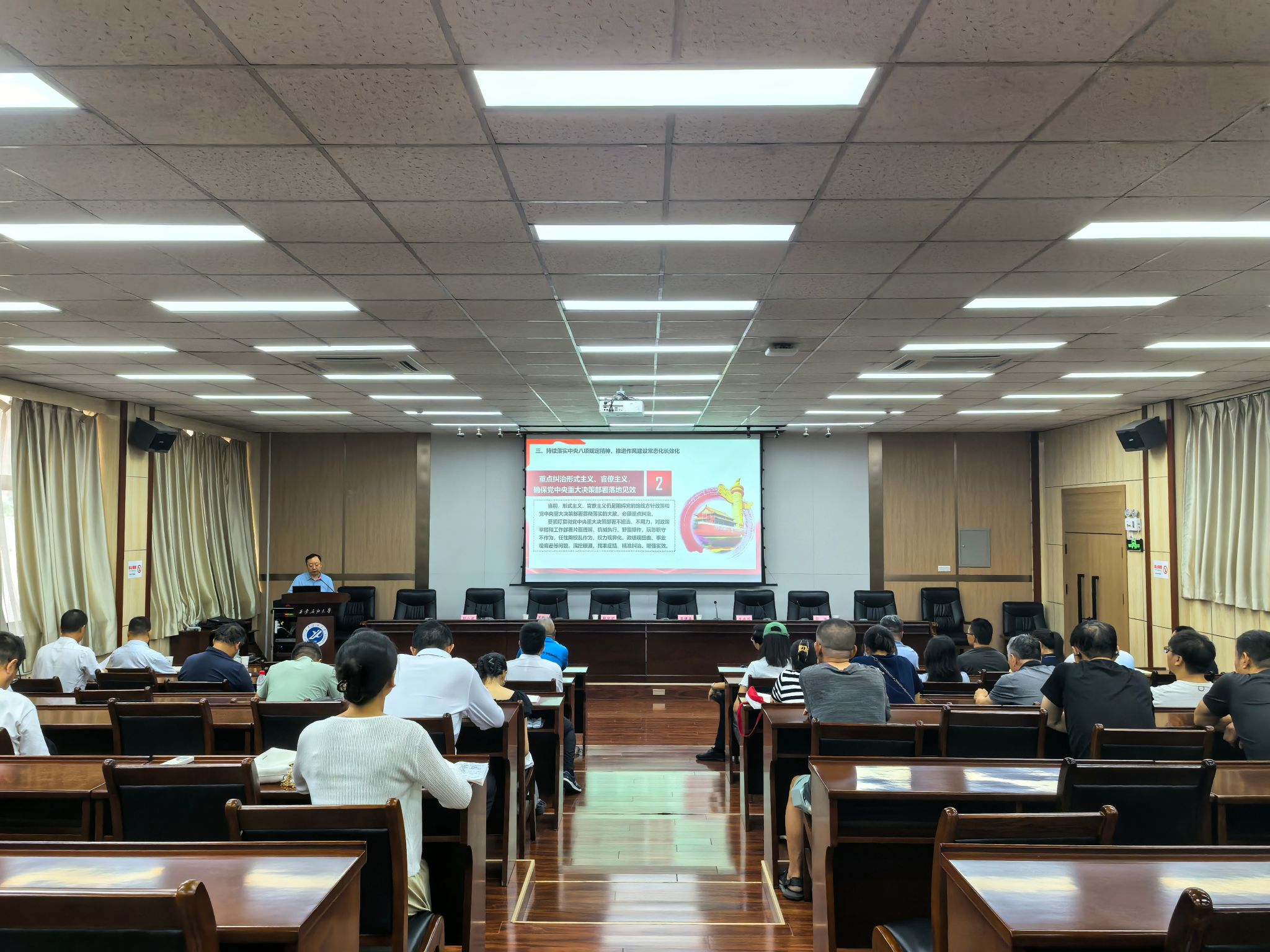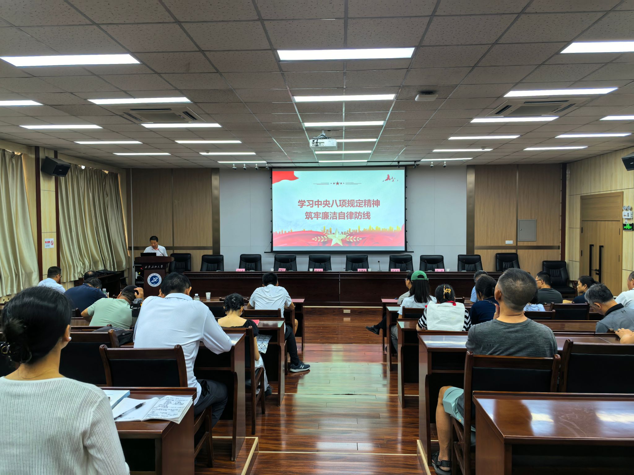 講授中,種宇宏首先帶領(lǐng)全體黨員回顧了中央八項(xiàng)規(guī)定的發(fā)展歷程,重溫了中央八項(xiàng)規(guī)定及《中央列出違反八項(xiàng)規(guī)定清單80條》主要內(nèi)容。進(jìn)而從持續(xù)糾治享樂主義、奢靡之風(fēng),堅(jiān)決防反彈回潮、防隱形變異、防疲勞厭戰(zhàn);重點(diǎn)糾治形式主義、官僚主義,確保黨中央重大決策部署落地見效;堅(jiān)持糾“四風(fēng)”樹新風(fēng)并舉,抓出自覺、形成習(xí)慣等三個(gè)方面,講述了如何持續(xù)落實(shí)中央八項(xiàng)規(guī)定精神,推進(jìn)作風(fēng)建設(shè)常態(tài)化長效化。最后,從突出“轉(zhuǎn)”字,強(qiáng)化作風(fēng)鍛造;突出“嚴(yán)”字,強(qiáng)化紀(jì)律養(yǎng)成;突出“防”字,強(qiáng)化執(zhí)紀(jì)監(jiān)督等三個(gè)方面,講述了如何聚焦全面從嚴(yán)治黨,鑄強(qiáng)校園風(fēng)清氣正廉潔生態(tài)。本次專題黨課講授內(nèi)容豐富,重點(diǎn)突出,深入解讀了中央八項(xiàng)規(guī)定的核心要義與實(shí)踐要求,并結(jié)合新時(shí)代黨風(fēng)廉政建設(shè)新形勢(shì),引導(dǎo)黨員干部筑牢思想防線,將規(guī)定精神內(nèi)化于心、外化于行,切實(shí)以優(yōu)良作風(fēng)推動(dòng)工作高質(zhì)量發(fā)展。