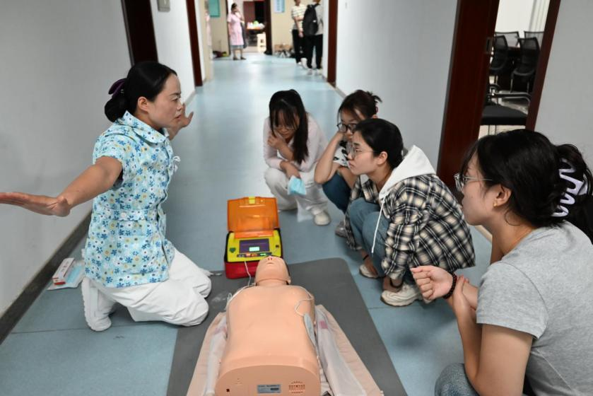 培訓(xùn)以“技能操作”為核心內(nèi)容,涵蓋心搏驟?,F(xiàn)場對成人進行心肺復(fù)蘇和使用自動體外除顫器(AED)、氣道異物梗阻現(xiàn)場應(yīng)用海姆立克急救法救助病患,以及緊急傷口包扎等實操技能的演示教學(xué)。