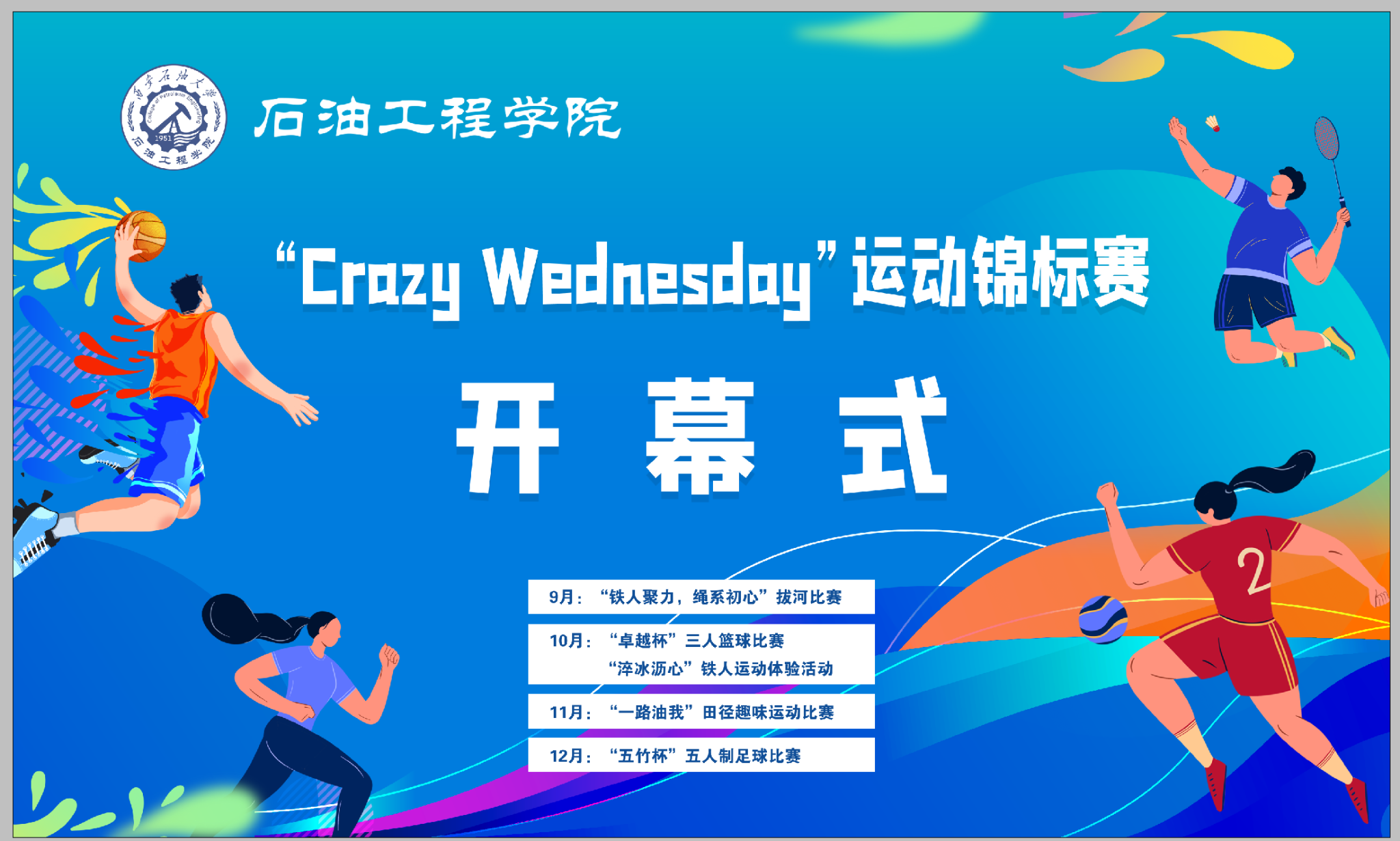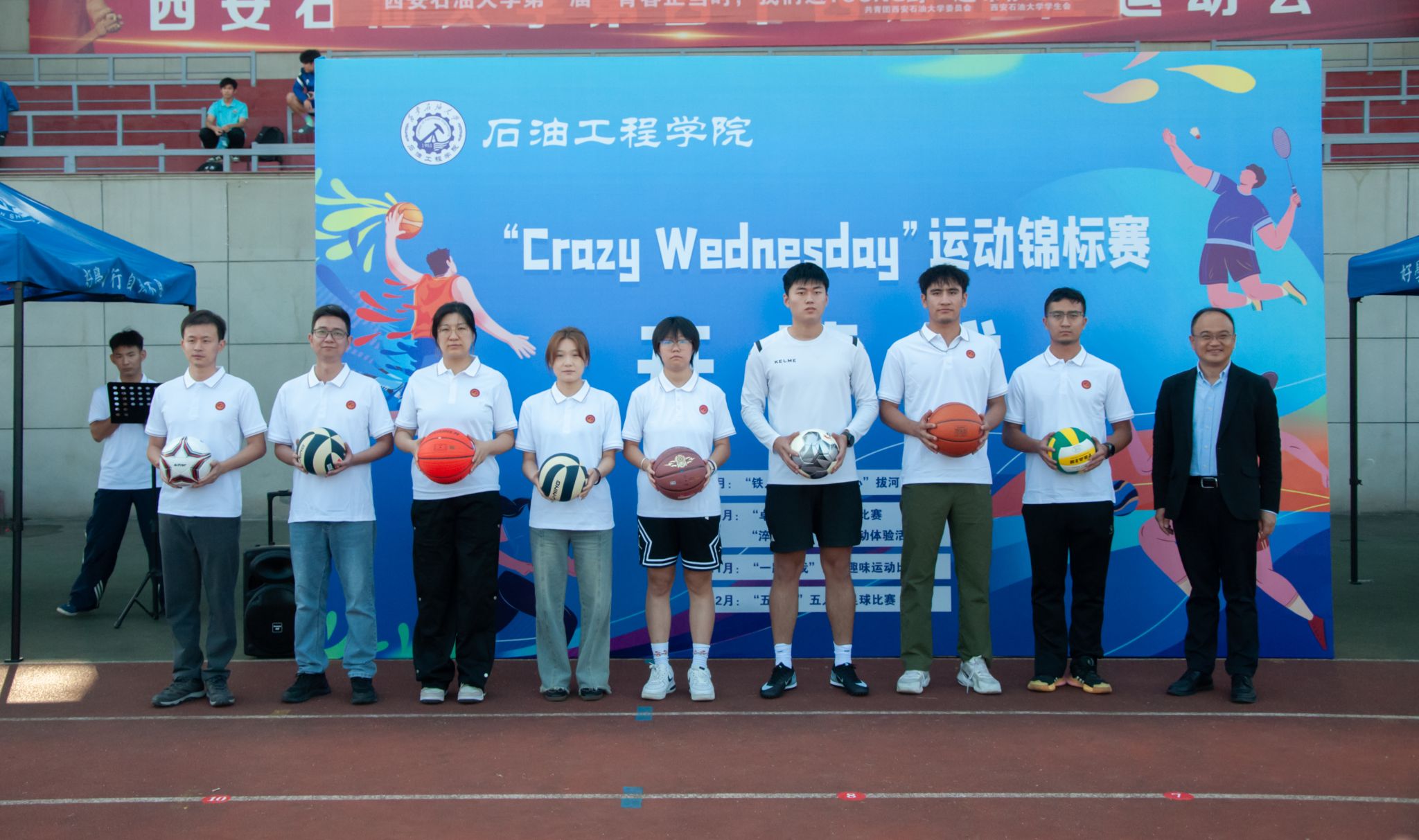 秋色浩無際,風(fēng)露洗晴空。924日,石油工程學(xué)院在鄠邑校區(qū)田徑場舉辦CRAZY WEDNESDAY瘋狂星期三運(yùn)動(dòng)錦標(biāo)賽開幕式。副校長趙健,黨委辦公室(校長辦公室)、黨委學(xué)生工作部、石油工程學(xué)院、體育學(xué)院負(fù)責(zé)同志,受聘教練員、師生代表300余人參加開幕式。