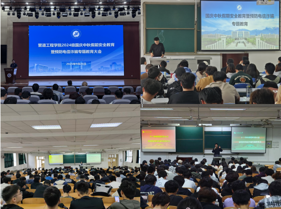 為切實(shí)增強(qiáng)學(xué)生的安全防范意識(shí),有效預(yù)防電信詐騙案件的發(fā)生,確保學(xué)生度過(guò)一個(gè)安全、祥和的假期,在國(guó)慶、中秋雙節(jié)來(lái)臨之際,9月24日-9月28日,管道工程學(xué)院各年級(jí)均開(kāi)展了國(guó)慶中秋節(jié)前安全教育暨預(yù)防電信詐騙專題教育大會(huì)。