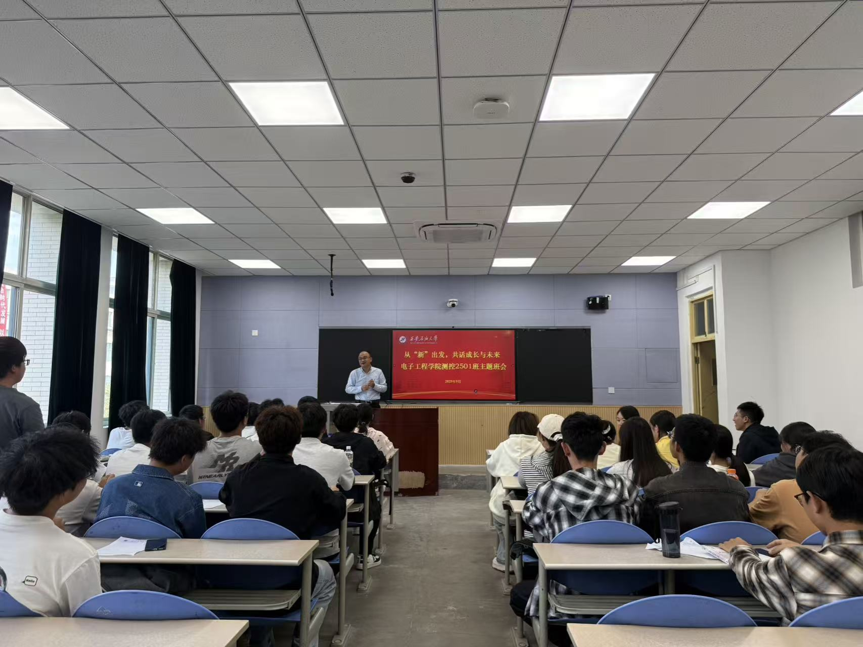 在專(zhuān)題授課環(huán)節(jié),趙健圍繞“融入新集體”與“規(guī)劃大學(xué)四年”兩大核心內(nèi)容展開(kāi)。他談到,大學(xué)是人生成長(zhǎng)的重要階段,融入新集體是開(kāi)啟大學(xué)生活的第一步。從宿舍關(guān)系維系、班級(jí)活動(dòng)參與到社團(tuán)活動(dòng)協(xié)作,每一次互動(dòng)都是提升溝通能力、培養(yǎng)團(tuán)隊(duì)精神的機(jī)會(huì),而良好的集體氛圍更是個(gè)人成長(zhǎng)的“助推器”。隨后,他從“人生規(guī)劃”“學(xué)業(yè)深耕”“能力提升”“品格塑造”四個(gè)維度,為新生如何有意義地度過(guò)四年大學(xué)時(shí)光提供方向指引。勉勵(lì)同學(xué)們始終牢記“好學(xué)力行、自強(qiáng)不息”的校訓(xùn),將個(gè)人成長(zhǎng)與能源事業(yè)發(fā)展緊密結(jié)合,筑牢專(zhuān)業(yè)基礎(chǔ),扎實(shí)學(xué)好專(zhuān)業(yè)知識(shí),積極參與科研實(shí)踐,傳承“石油精神”“鐵人精神”,在集體中錘煉意志、增長(zhǎng)才干,努力成長(zhǎng)為兼具專(zhuān)業(yè)素養(yǎng)與責(zé)任擔(dān)當(dāng)?shù)男聲r(shí)代能源人才,為國(guó)家能源事業(yè)發(fā)展貢獻(xiàn)西石大力量。