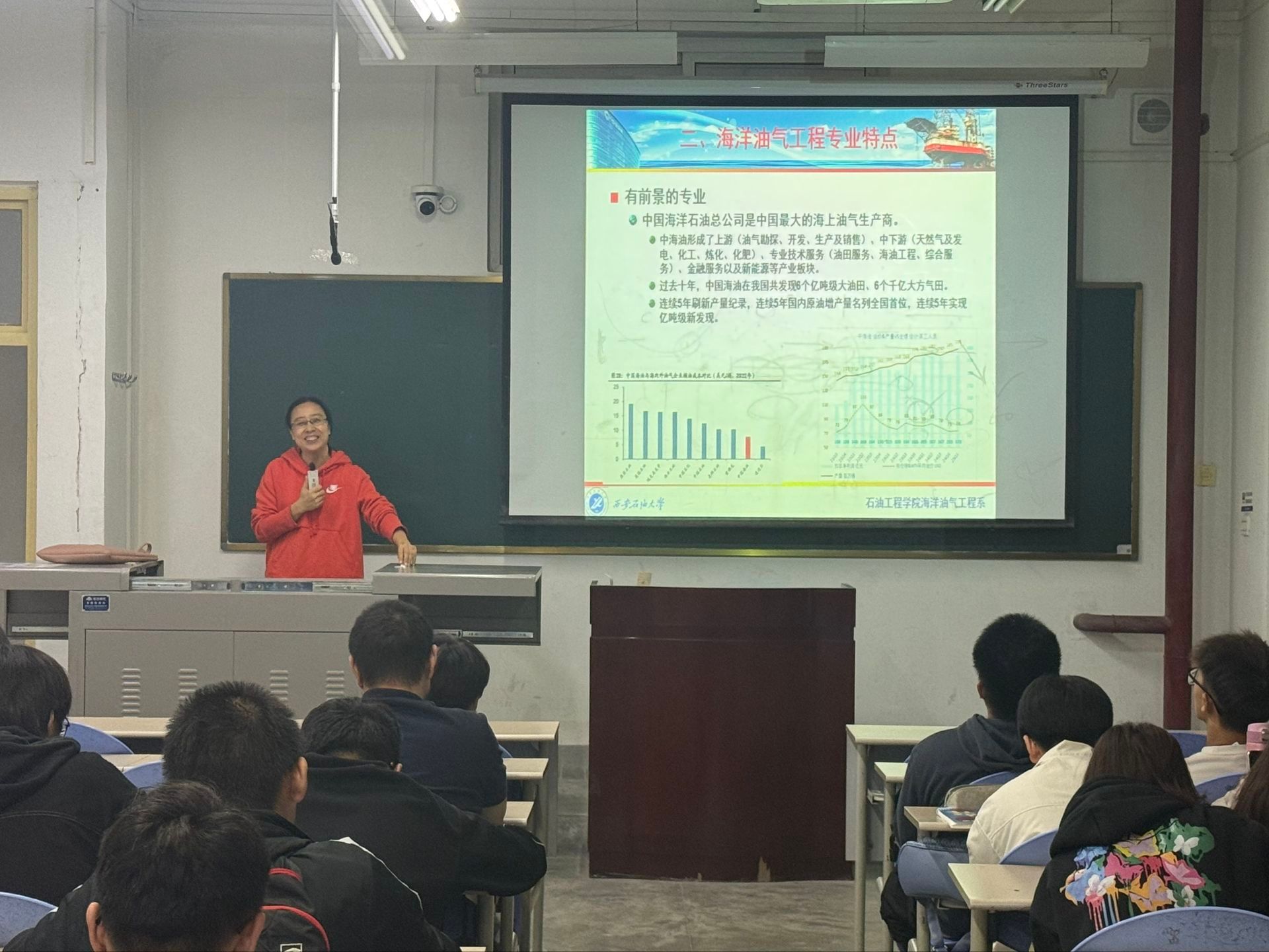 同日下午,蔣海巖教授在博覽樓A225為海油2501、2502班開展專業(yè)教育。她結(jié)合海洋油氣工程的實際需求,強調(diào)學生需扎實掌握專業(yè)理論、工程技能及外語計算機應用能力,同時具備團隊協(xié)作與創(chuàng)新意識?,F(xiàn)場還展示了專業(yè)實驗室設備及獲獎成果,激勵學生以行業(yè)標桿為榜樣,不斷追求卓越。