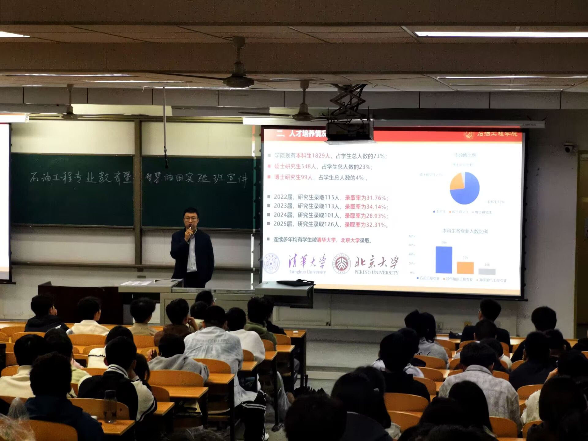 10月11日下午,王琛在博覽樓A139為石工卓越2501、2502班和石工2501—2506學生開展專業(yè)教育。他詳細介紹了學院整體情況,人才培養(yǎng)情況和教學改革創(chuàng)新方面的基本情況。重點圍繞學院近年來在教學改革方面的舉措,包括設立“智慧油田實驗班”,以“油氣工程+人工智能”為特色,通過小班化、前沿性教學模式,培養(yǎng)兼具工程實踐能力和創(chuàng)新思維的高層次人才。他鼓勵學生充分利用學院資源,積極參與學科競賽和科研項目,提升國際化視野與跨學科能力