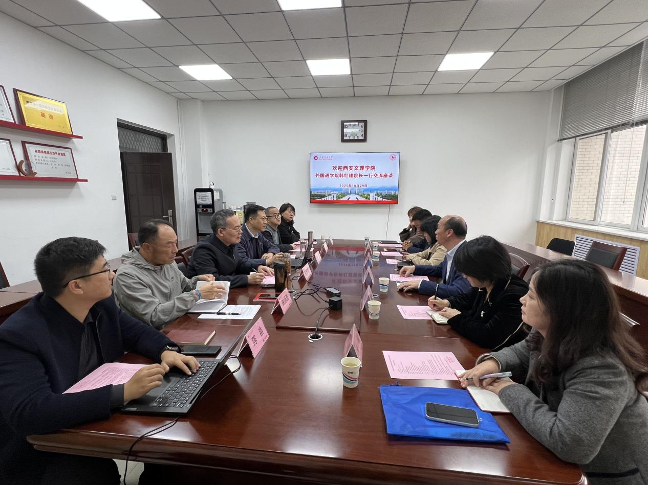 10月29日,西安文理學(xué)院外國(guó)語(yǔ)學(xué)院院長(zhǎng)韓紅建一行6人蒞臨我校外國(guó)語(yǔ)學(xué)院座談交流。座談交流會(huì)在鄠邑校區(qū)崇文樓314會(huì)議室召開(kāi)。雙方學(xué)院黨政領(lǐng)導(dǎo)和骨干教師代表圍繞辦學(xué)思路、人工智能發(fā)展背景下外語(yǔ)學(xué)科發(fā)展思路的思考和實(shí)踐、課程設(shè)置、課程體系建設(shè)、教學(xué)改革、人才培養(yǎng)質(zhì)量等議題展開(kāi)交流探討。