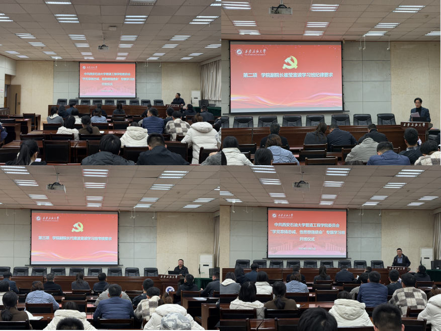 為深入學(xué)習(xí)貫徹黨的二十屆四中全會精神,落實學(xué)校第三次黨代會精神,全面提升基層黨組織建設(shè)質(zhì)量,強化二級學(xué)院的政治屬性和育人責(zé)任,促進黨建和中心工作融合互促,重點提升教師特別是黨員教師在教學(xué)、科研、管理和學(xué)習(xí)中的模范帶頭作用,結(jié)合深入貫徹中央八項規(guī)定精神學(xué)習(xí)教育工作安排,11月21日,管道工程學(xué)院黨委在雁塔校區(qū)第三會議室舉辦了“學(xué)黨章鑄忠誠,悟思想強使命”專題學(xué)習(xí)班開班儀式,學(xué)院班子全體成員、全體教職工、研究生黨員代表參加了會議。學(xué)院學(xué)生工作辦公室主任孫劍秋主持會議。