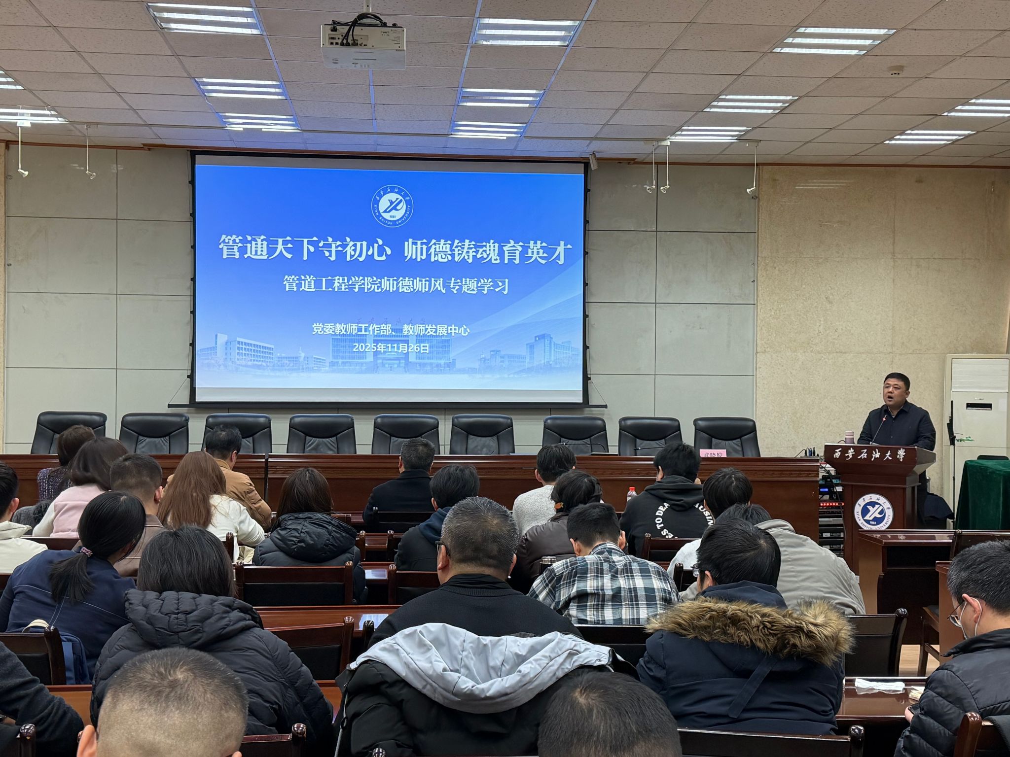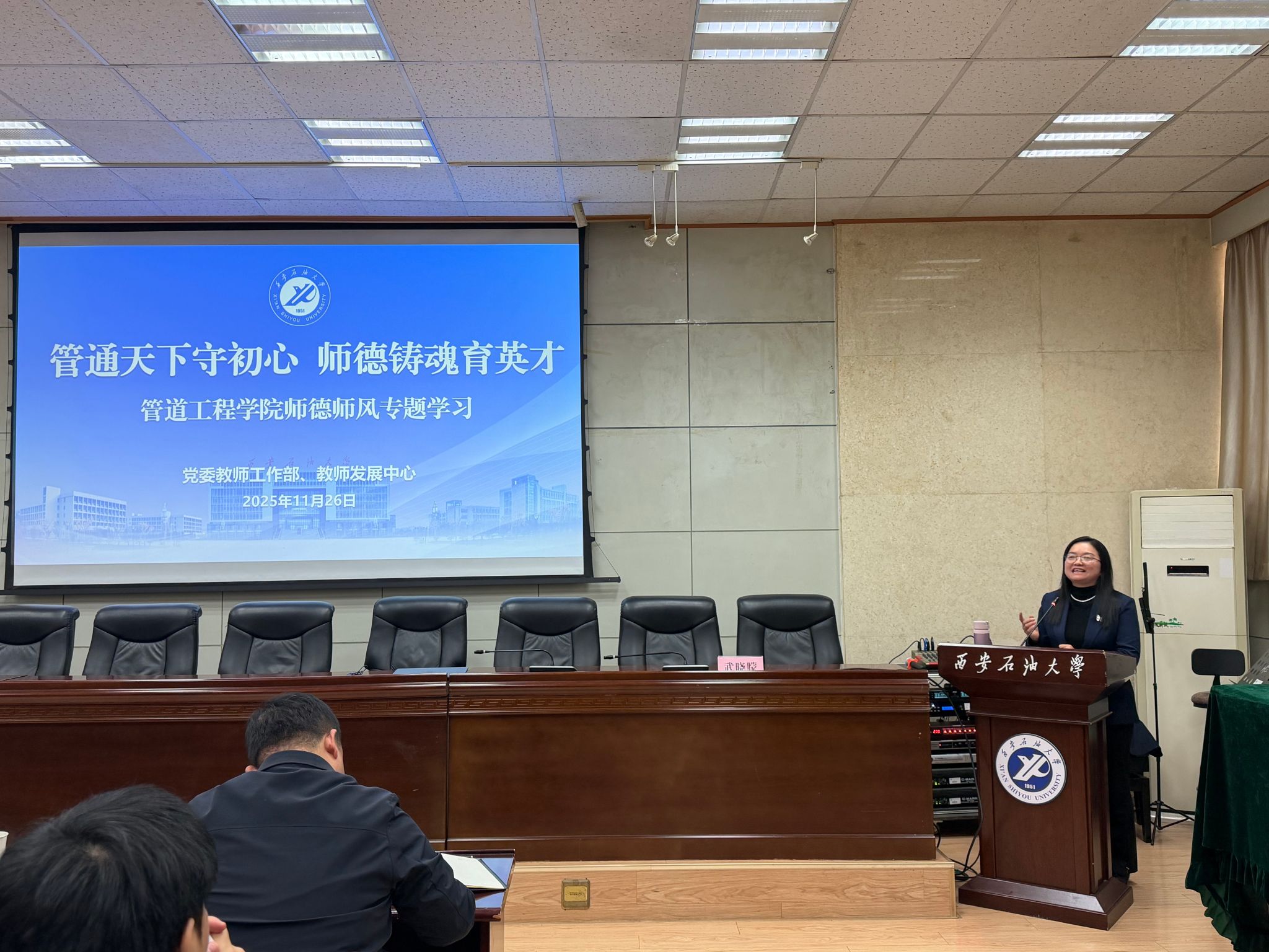 11月26日下午,由管道工程學(xué)院黨委主辦的“學(xué)黨章鑄忠誠,悟思想強使命”專題學(xué)習(xí)班第一講在雁塔校區(qū)西階第三會議室舉行。校黨委教師工作部部長、教師發(fā)展中心主任武曉朦教授擔(dān)任主講,主講題目為“管通天下守初心 師德鑄魂育英才”,學(xué)院全體教職工及研究生代表參加學(xué)習(xí)。會議由學(xué)院黨委副書記高亮主持。