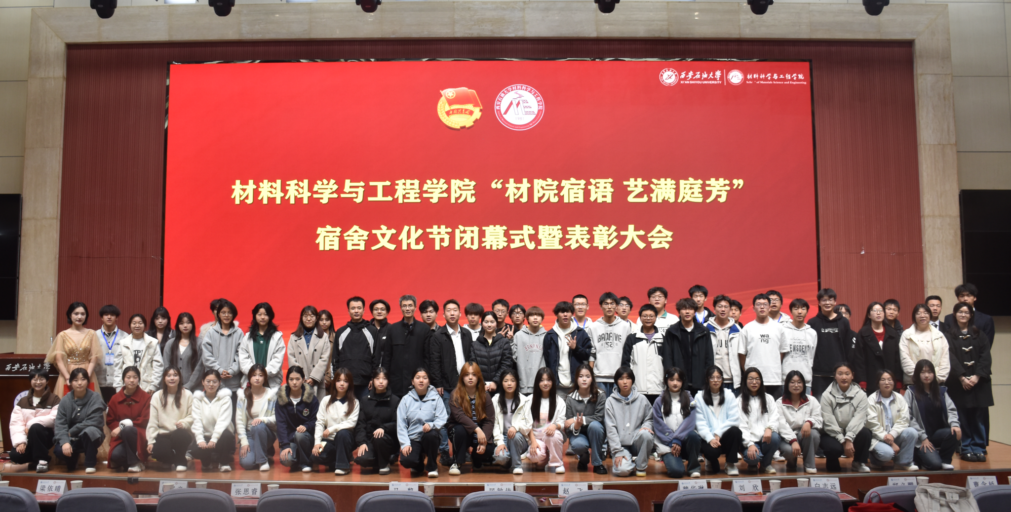 1128日晚,材料科學(xué)與工程學(xué)院2025年“材院宿語(yǔ)·藝滿(mǎn)庭芳 宿舍文化節(jié)閉幕式暨表彰大會(huì)在鄠邑校區(qū)弘石學(xué)術(shù)報(bào)告廳隆重舉行。學(xué)院黨委副書(shū)記屈敏佳、學(xué)生工作辦公室副主任趙飛、各年級(jí)輔導(dǎo)員、團(tuán)委和學(xué)生會(huì)主要負(fù)責(zé)人及四百余名學(xué)生代表參加。