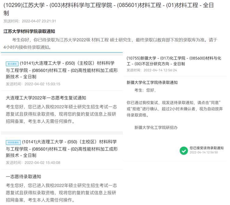 披星戴月走過的路終會以繁花以答。終于在四月初,王園媛成功調(diào)劑到江蘇大學,楊思琦成功調(diào)劑到新疆大學。至此,535終于全員上岸。雖然一路艱險,一路波折,但是最終的結(jié)果沒有辜負她們的努力。