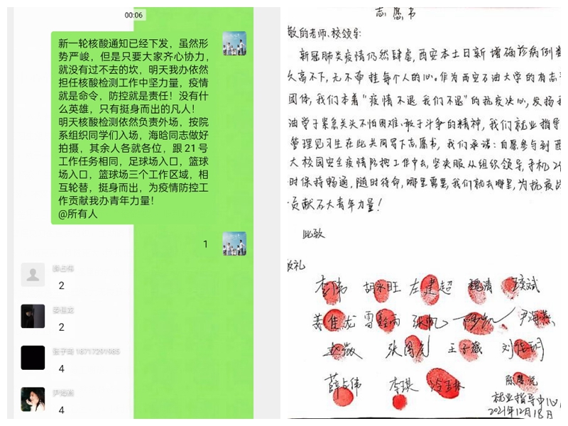 大“疫”面前,人人有責(zé),人人盡責(zé)。在眾多的學(xué)生志愿者中,由學(xué)生工作部(處)就業(yè)指導(dǎo)中心組織的18名大學(xué)生管理見習(xí)生志愿者分外搶眼。無論是在凌晨、還是深夜,他們24小時(shí)待命,隨時(shí)集結(jié)。在鄠邑校區(qū)全員核酸檢測(cè)的現(xiàn)場(chǎng),每次都有他們忙碌的身影,往往是連續(xù)奮戰(zhàn)10幾個(gè)小時(shí)。他們秉持“團(tuán)結(jié)、務(wù)實(shí)、認(rèn)真、高效”理念,敢于沖鋒、敢于斗爭(zhēng)、敢于勝利,鍛造出堅(jiān)如磐石、舍生忘己、心懷眾“生”的可貴品質(zhì)。