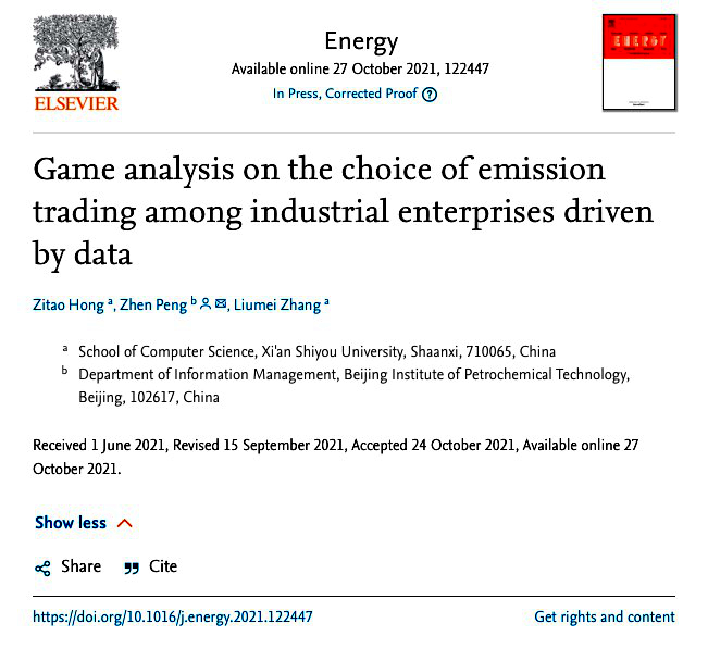 計(jì)算機(jī)學(xué)院電子信息(計(jì)算機(jī)技術(shù))專業(yè)碩士研究生洪子濤同學(xué)、導(dǎo)師張留美副教授和北京石油化工學(xué)院彭珍教授共同合作撰寫(xiě)的論文《Game analysis on the choice of emission trading among industrial enterprises driven by data》,日前收到國(guó)際SCI期刊《Energy》的論文錄用接收函,并已完成對(duì)該論文樣稿的校對(duì),在該期刊網(wǎng)上上線。據(jù)悉,《Energy》是由英國(guó)佩加蒙愛(ài)思唯爾科學(xué)有限公司出版,是能源動(dòng)力領(lǐng)域國(guó)際Top期刊,目前影響因子7.147。在中國(guó)科學(xué)院文獻(xiàn)情報(bào)中心期刊分區(qū)表中(2020年12月最新升級(jí)版),屬于一區(qū)刊物。
