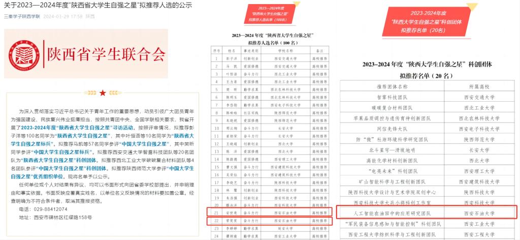 近日,由團省委、省學聯(lián)開展的尋訪2023-2024年度“陜西省大學生自強之星”活動結果揭曉,我校石油工程學院儲運2103班安世亮、經濟管理學院商務2101班常笑笑榮獲“陜西省大學生自強之星”,石油工程學院“人工智能在油田中的應用研究”團隊榮獲“陜西大學生自強之星”科創(chuàng)團體,其中安世亮被擬推薦為2023-2024年度“中國大學生自強之星”候選人。